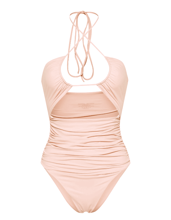 "Strój kąpielowy/body w kolorze brudnego różu, marszczony na przodzie, wiązany na szyi, wycięcie pod biustem, głęboki zaokrąglony dekolt. Rozmiar z metki FR 34. Skład: 80% poliamid, 20% elastan. Wymiary: szerokość mierzona od pachy do pachy 32cm, długość całkowita 45,5cm."