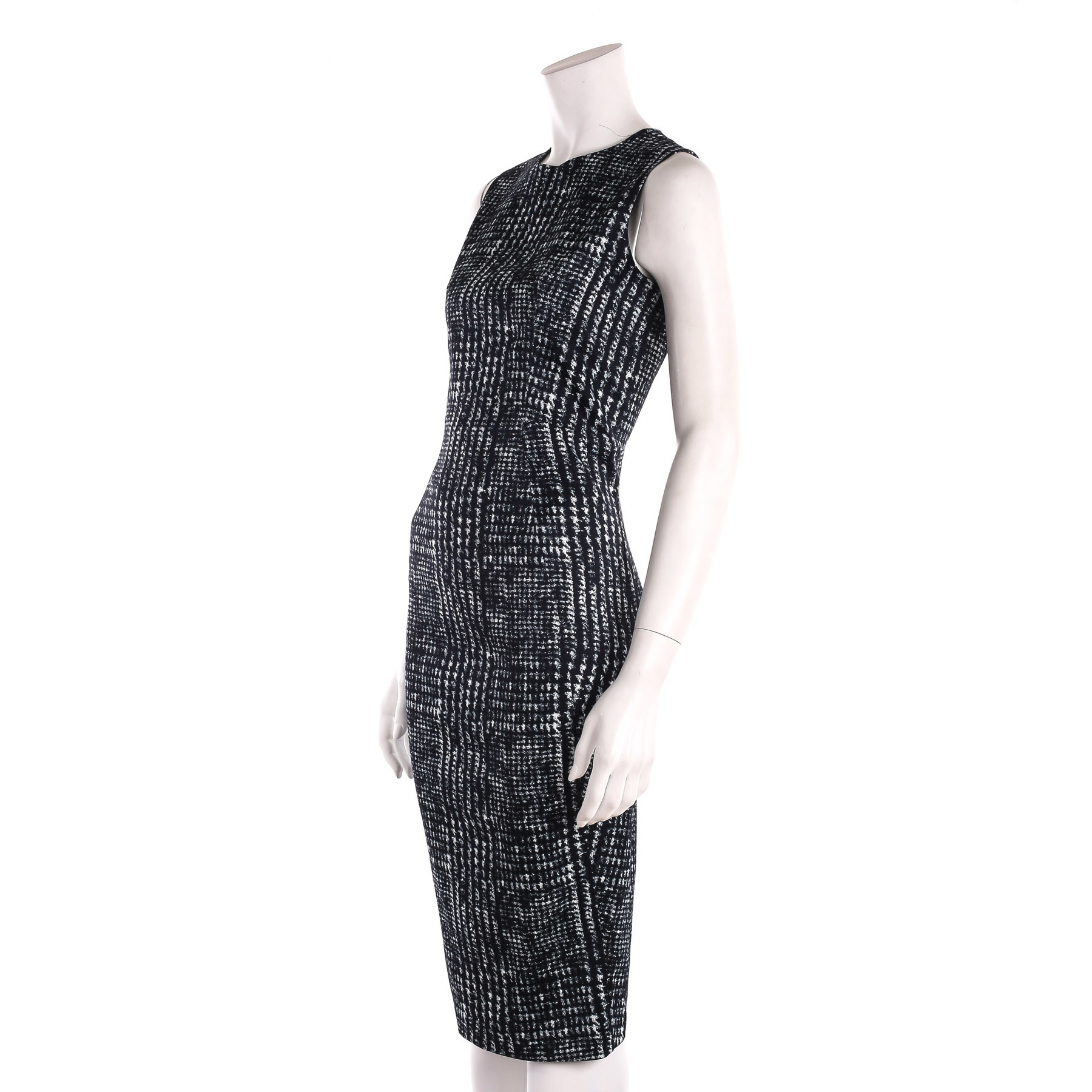 "Pasowana sukienka bez rękawów , w granatowo niebieski wzór. Zapinana na suwak. Wykonana 98% wiskozy i 2% elastanu , rozmiar 36"