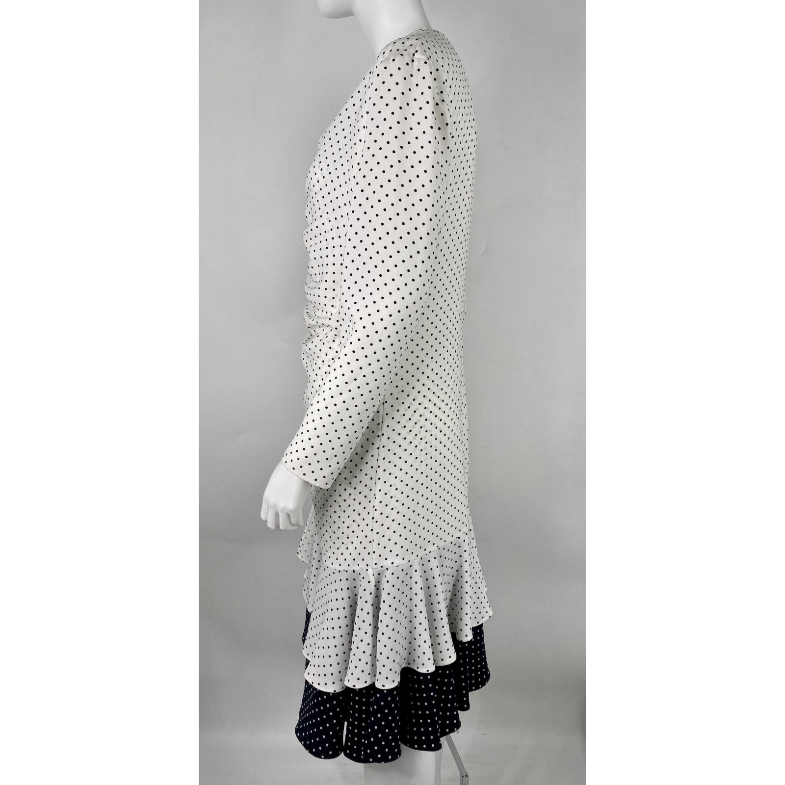 "Biała sukienka w czarne kropki, zapinana na napy, długi rękaw. Przód marszczony, u dołu dwie falbany, jedna z nich w odwrotnych kolorach niż cała sukienka. Stan bardzo dobry, rozmiar z metki 38. Skład: 80% acetate 20% polyethylene. Wymiary: szer. ramiona 43 cm, szer. biust 45 cm, szer. talia 40 cm, dł. rękaw 56 cm, dł. całkowita 108 cm."