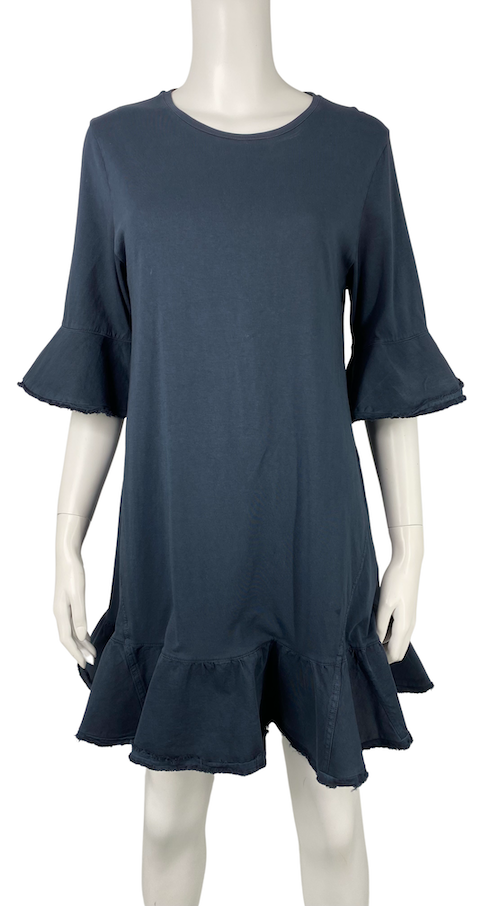 "granatowa bawełniana sukienka typu oversize, krótki rękaw, dół sukienki oraz rękaw zakończony falbankami, roz. z metki 0, skład: 100% bawełna.Wymiary: dł. całkowita 79 cm, szer.biust 44 cm, szer. ramiona 44 cm"