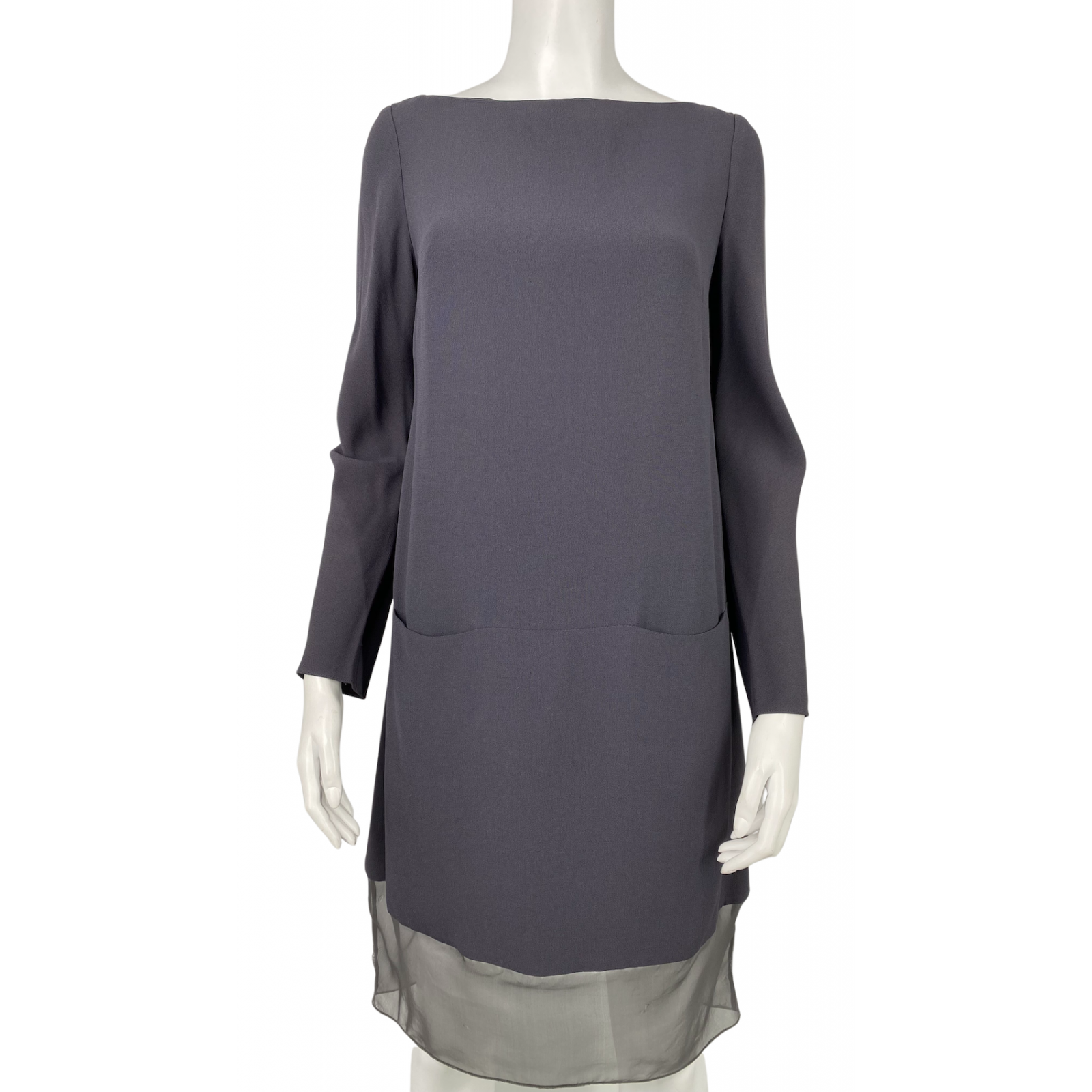 "grafitowa sukienka z długim rękawem, zakończona transparentną, szarą taśmą, rozm 10, 100% jedwab. Wymiary: szerokość w biuście 49 cm, szerokość w ramionach 38 cm, długość całkowita 98 cm, dł. rękaw 60 cm, szer. biodra 60 cm"
