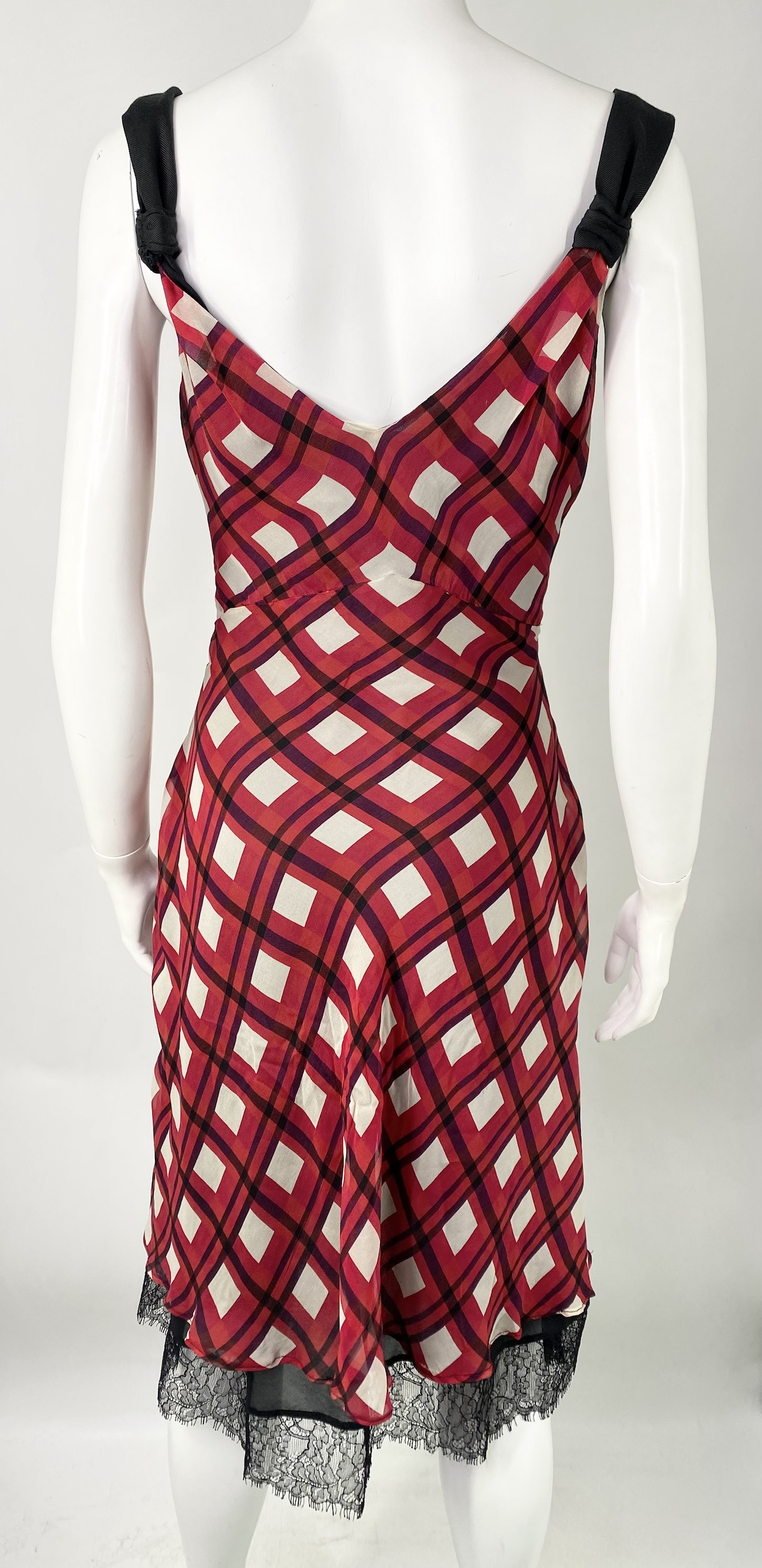 "Dwuwarstwowa sukienka dopasowana w kratkę czerwono-biało-fioletowo-czarną, odcięta w talii, rozkloszowana na dole, dekolt w serek z przodu i z tyłu, czarne ramiączka, spodnia warstwa zakończona koronką, wycięta metka z rozmiarem (prawdopodobnie XS) i składem.