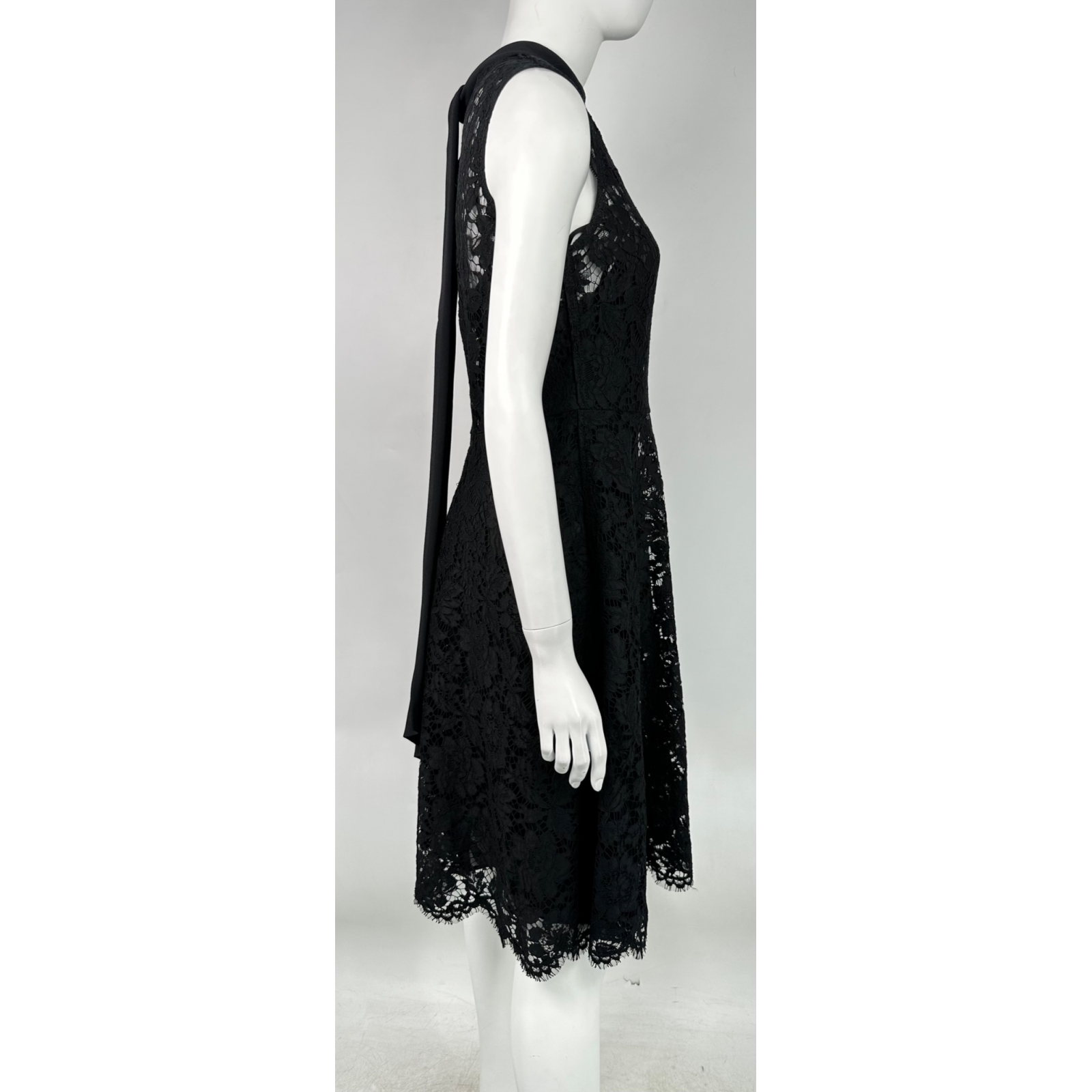 "czarna ażurowa sukienka bez rękawów, przy kołnierzu wiązana wstążka, zapięcie z tyłu na suwak, dół lekko rozkloszowany. Rozmiar IT 42. Skład: 91% jedwab, 9% elastan. Wymiary: szer. ramion 33 cm, szer. biustu 41 cm, szer. talii 37 cm, dł. całkowita 99 cm."