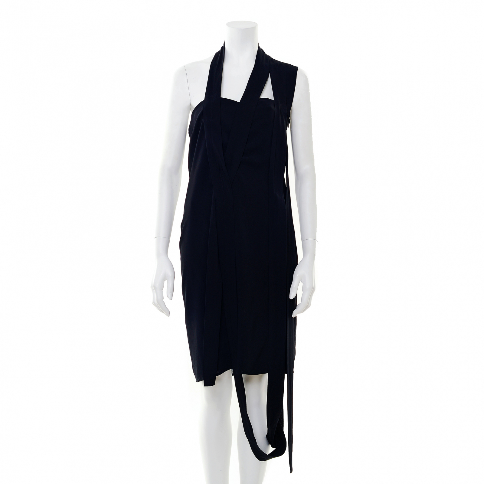 "Czarna sukienka na jedno ramię , z asymetrycznymi wstążkami. Wykonana z 95% wiskozy i 5% elastanu , rozmiar M"