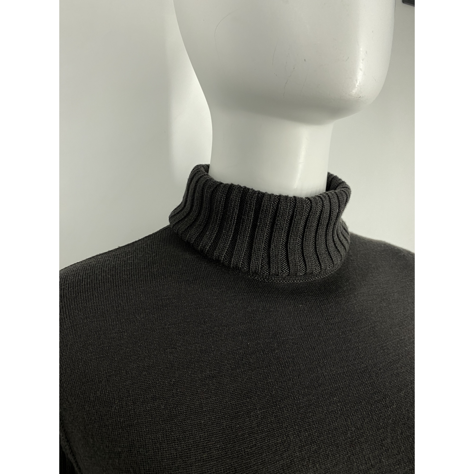 "brązowa sukienka z golfem i długim rękawem w formie ściągaczu, z przodu motyw spódnicy zapinanej na klamerkę. Rozmiar 44. Skład: 100 % wełna.