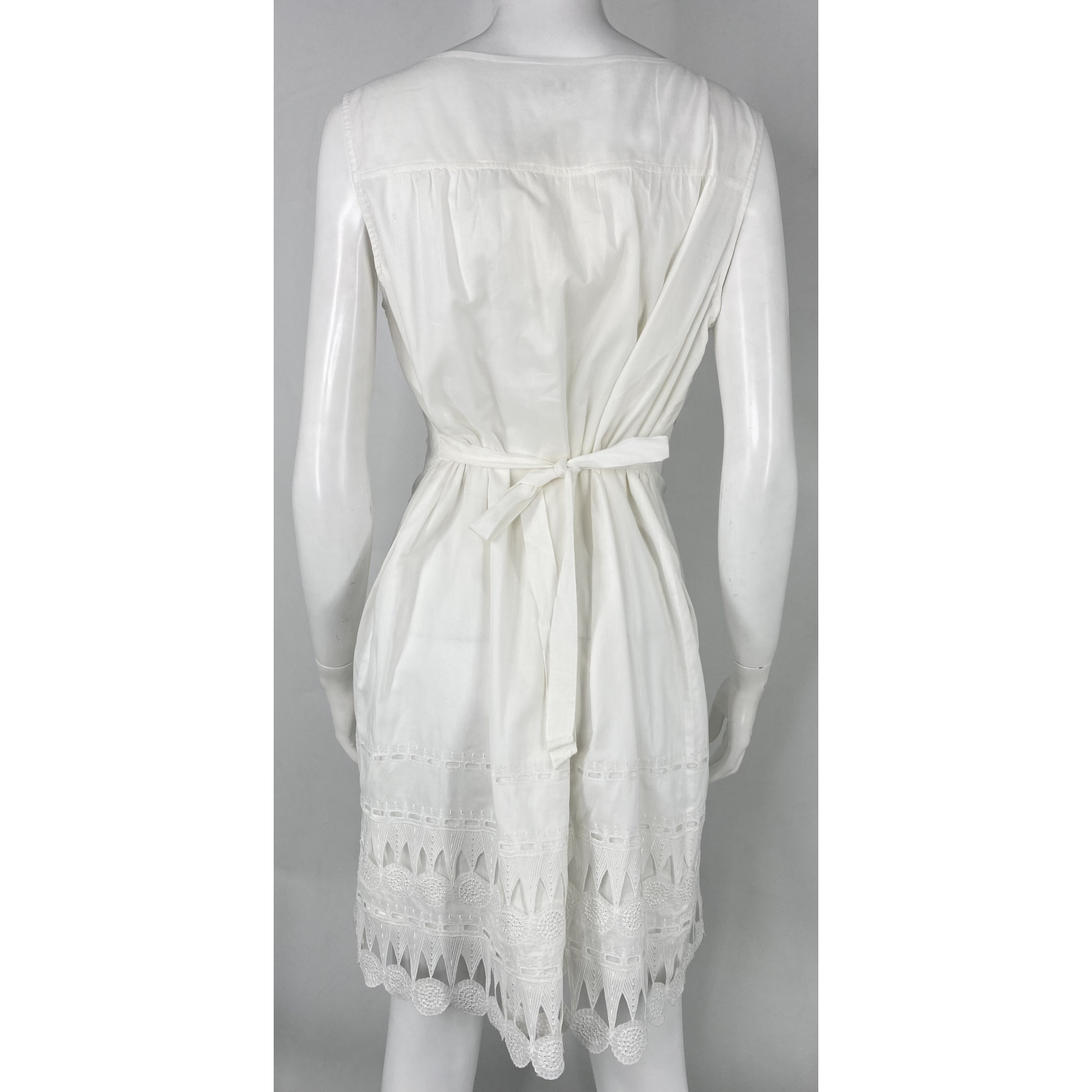 "biała bawełniana letnia sukeinka bez rękawów, wiązana w pasie tasiemką, dół haftowany, skład:100% bawełna."