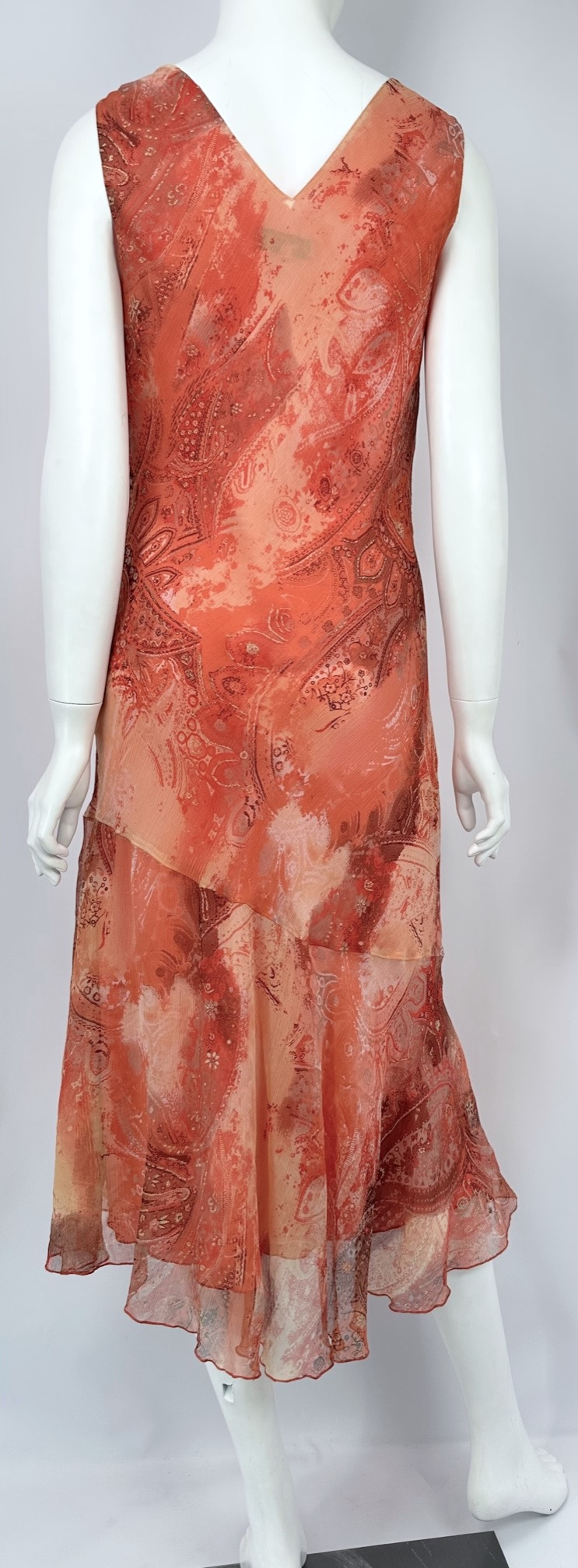 "sukienka bez rękawów, pomarańczowa we wzory ze złotą nitką, dopasowana. Rozmiar z metki 40. Skład: 100% jedwab, podszewka 100% poliester. Wymiary: szer. ramion 37 cm, szer. biustu 46 cm, szer. talii 41 cm, dł. całkowita 125 cm."