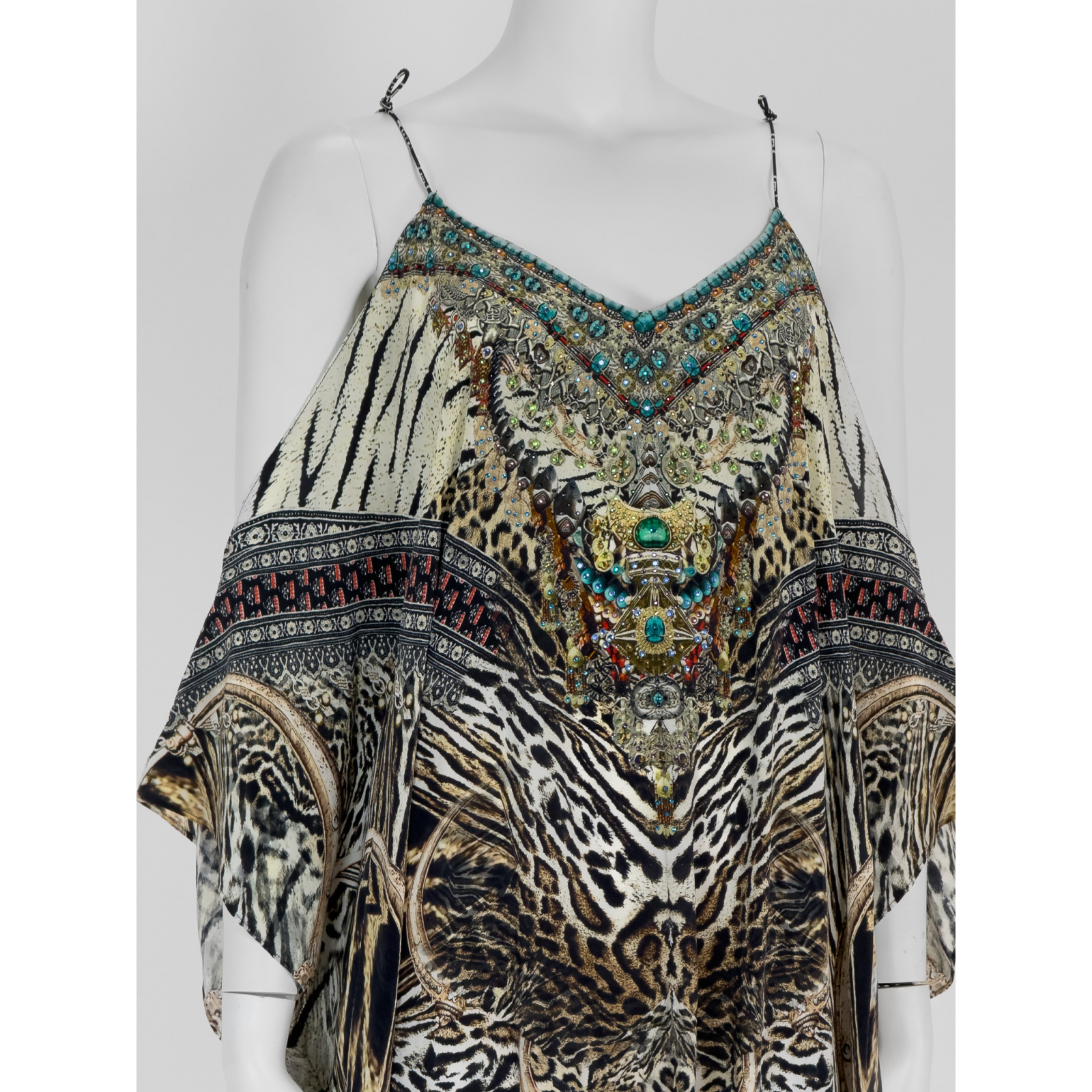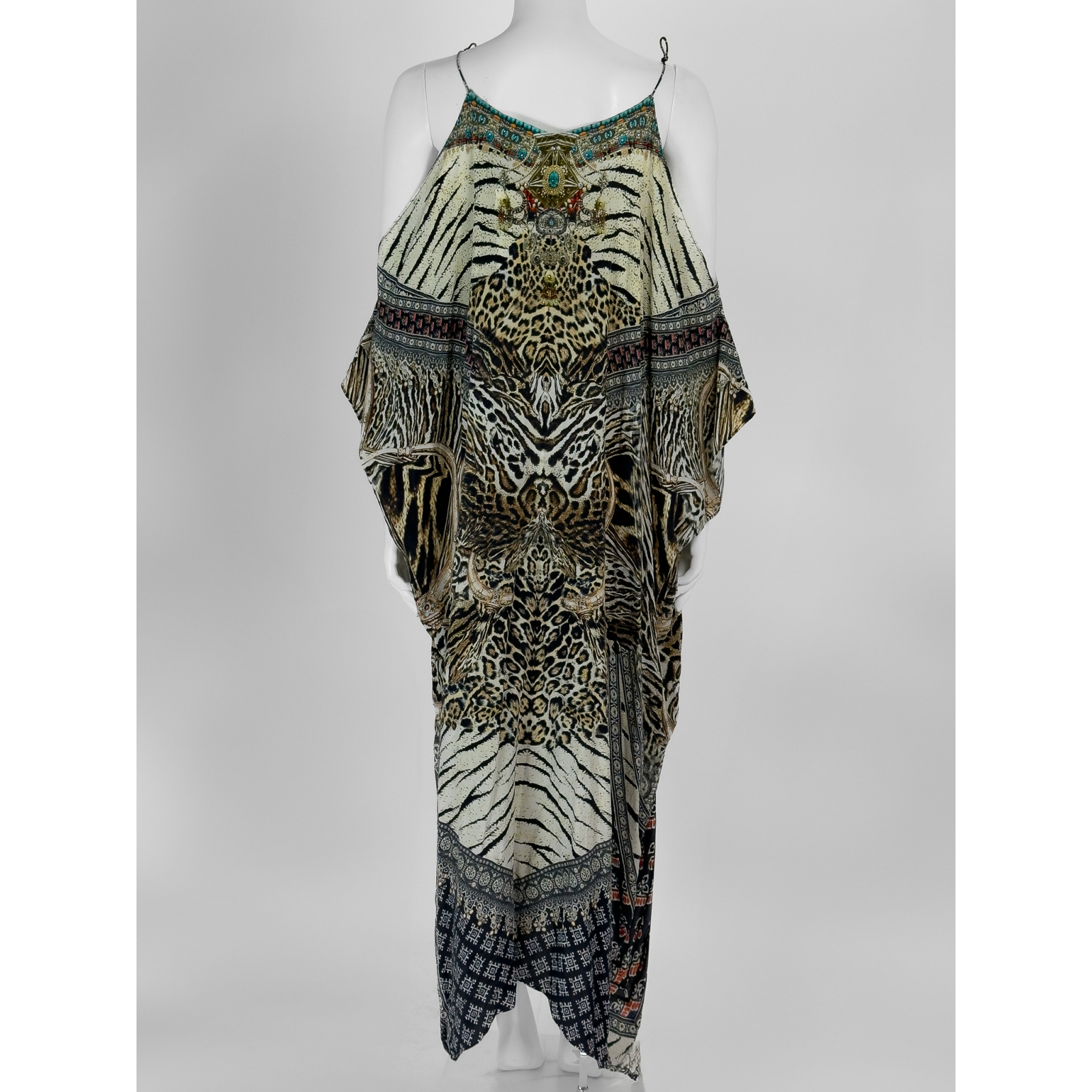 "Sukienka maxi w etniczne wzory, na cienkich ramiączkach z otwartym rękawem, przód ozdobiony kolorowymi cyrkoniami. Stan bardzo dobry. Rozmiar z metki S. Wymiary: szerokość mierzona od pachy do pachy 105cm, długość całkowita 142cm."