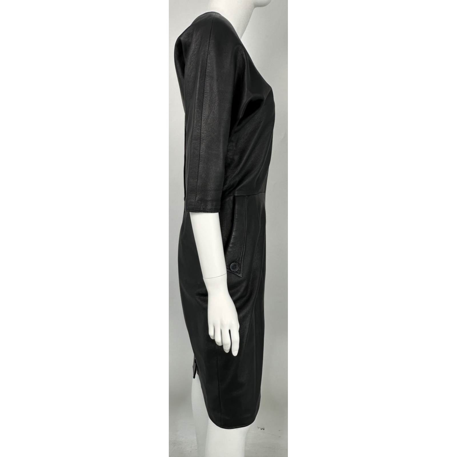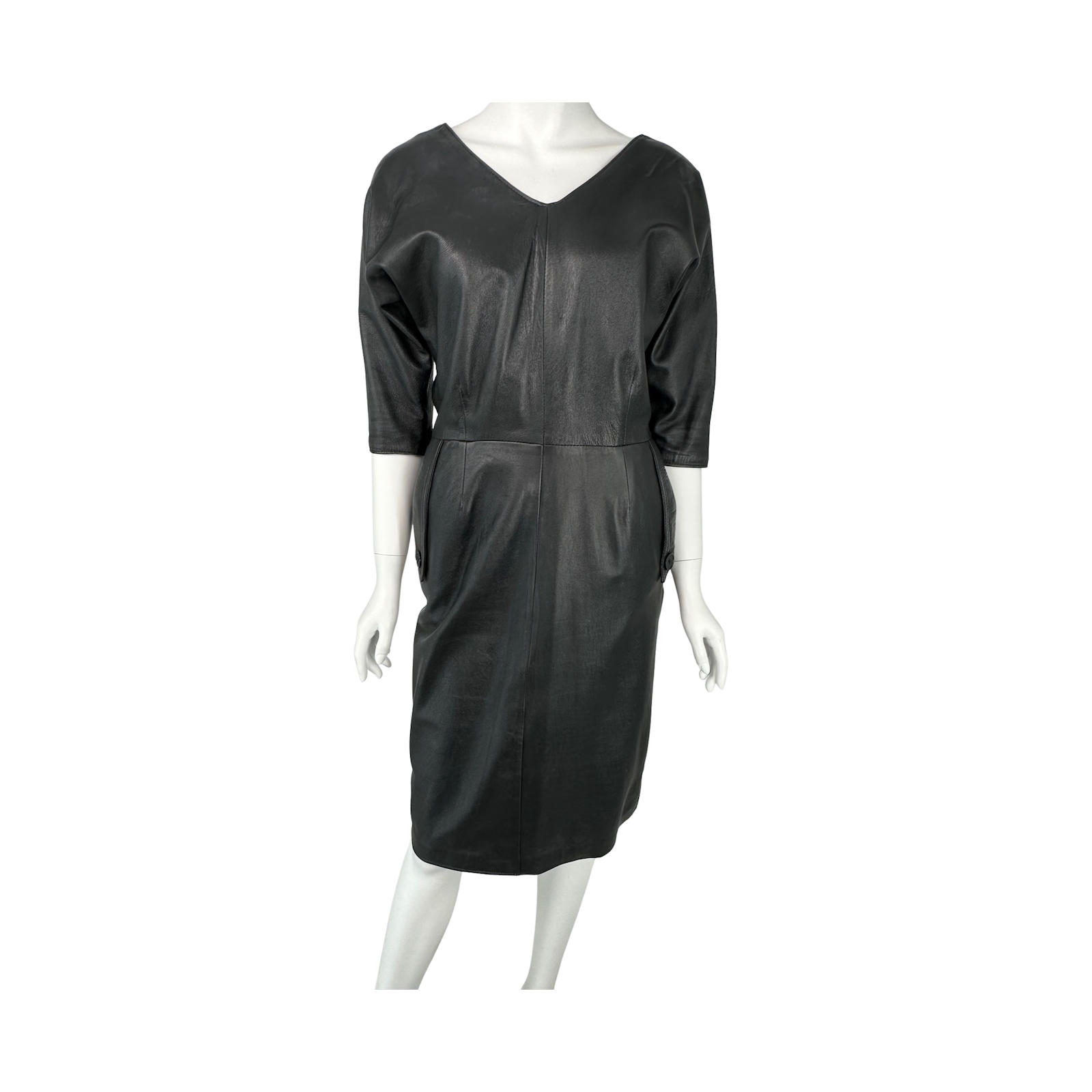 "czarna sukienka skórzana, dopasowana , rękaw 3/4 , zapinana z przodu na guziki, dekolt w kształcie litery V również z tyłu, boczne kieszenie. Brak metki z rozmiarem i składem. Wymiary: szer. ramion 52 cm, szer. biustu 47 cm, szer. talii 39 cm, dł. całkowita 103 cm, dł. rękawa 30 cm."