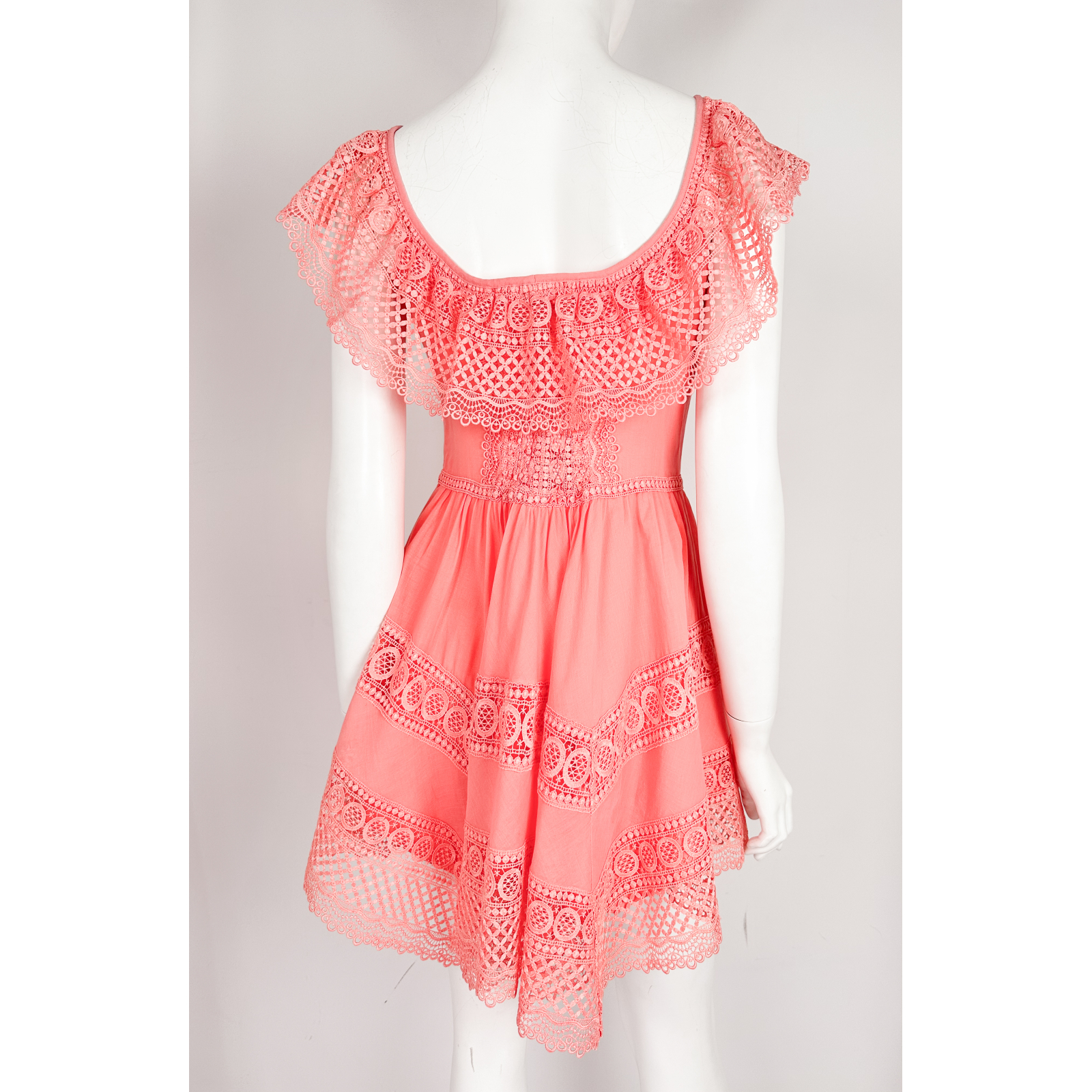 "Sukienka w stylu boho krótka w kolorze łososiowym, wykończona koronkowymi wstawkami, bawełniana podszewka. Rozmiar M. Wymiary: szerokość mierzona od pachy do pachy 42cm, długość całkowita 85cm."