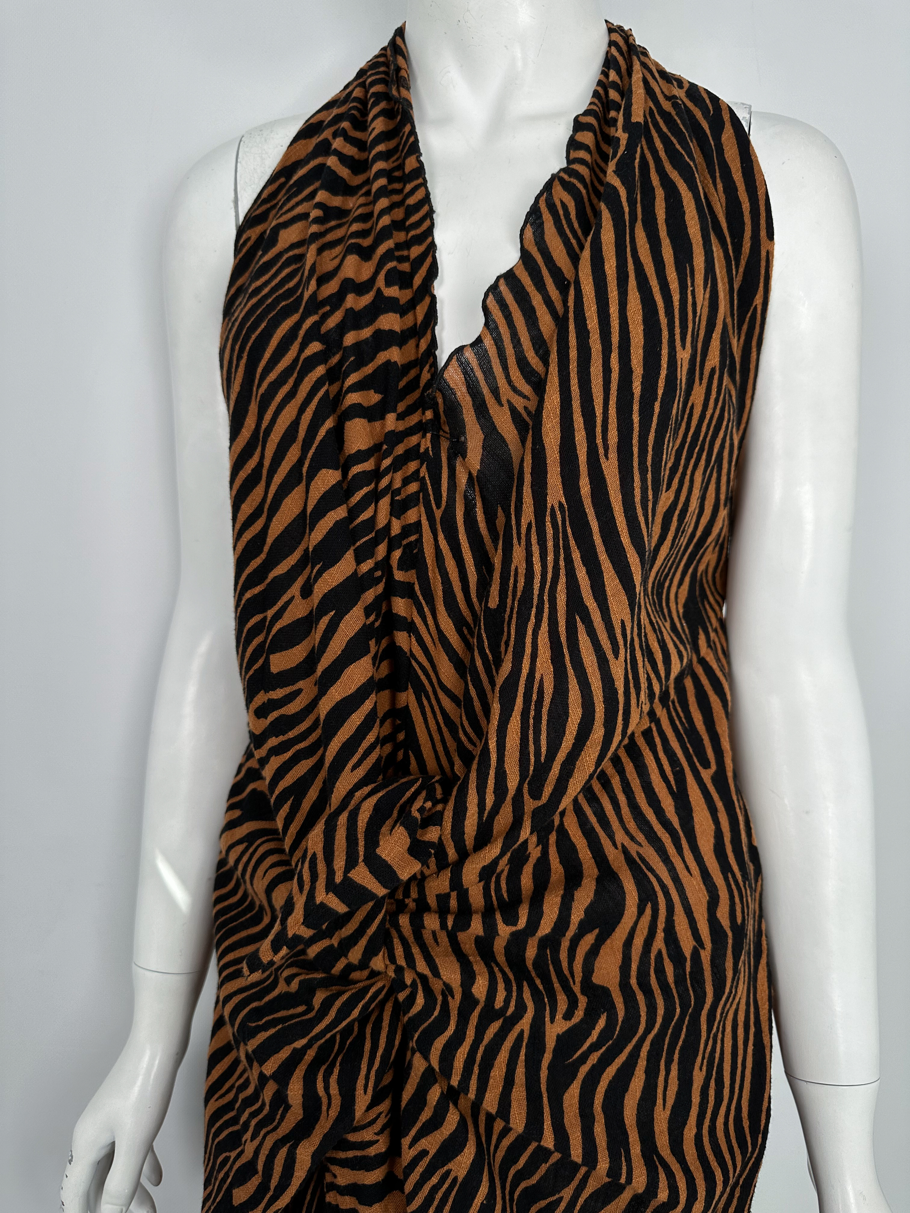 "Sukienka szeroka w motyw zebry camelowo-czarna. 100% bawełna. Rozmiar wypada S. Wymiary: szerokość mierzona od pachy do pachy 66cm, długość całkowita 151cm."