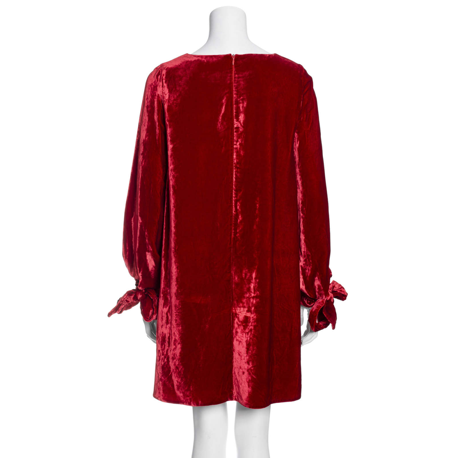 "Czerwona sukienka z długim rękawem , wiązania przy rękawach , wykonana z weluru; wymiary: ramiona 39, długość rękawa 68, biust 47, talia 53, długość całkowita 91"