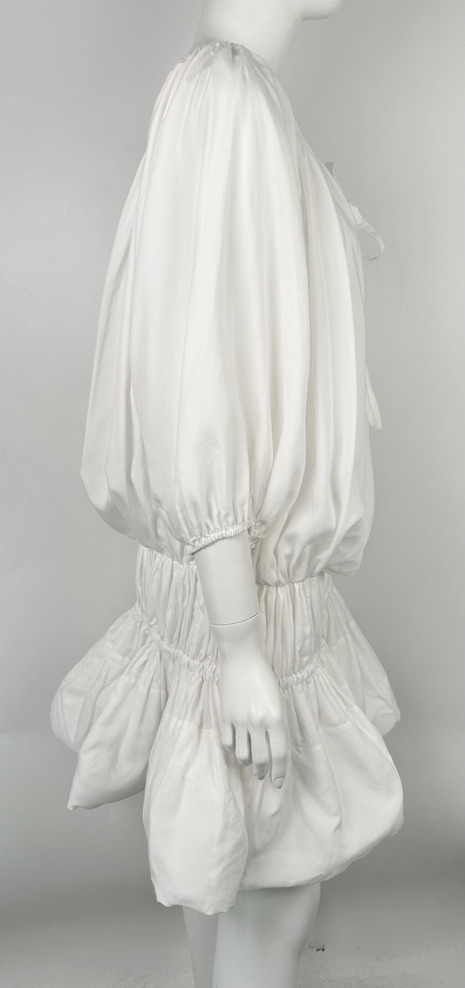 "Biała mini sukienka, długi rękaw, dół ozdobiony usztywnianą falbaną, dekolt i rękawy wykończone gumką. Brak metki z rozmiarem, Skład: 100 % tencel. Wymiary: szer. ramion 35 cm, szer. biustu 50 cm, szer. talii 29 cm, dł. całkowita 90 cm, dł. rękawa 47 cm."