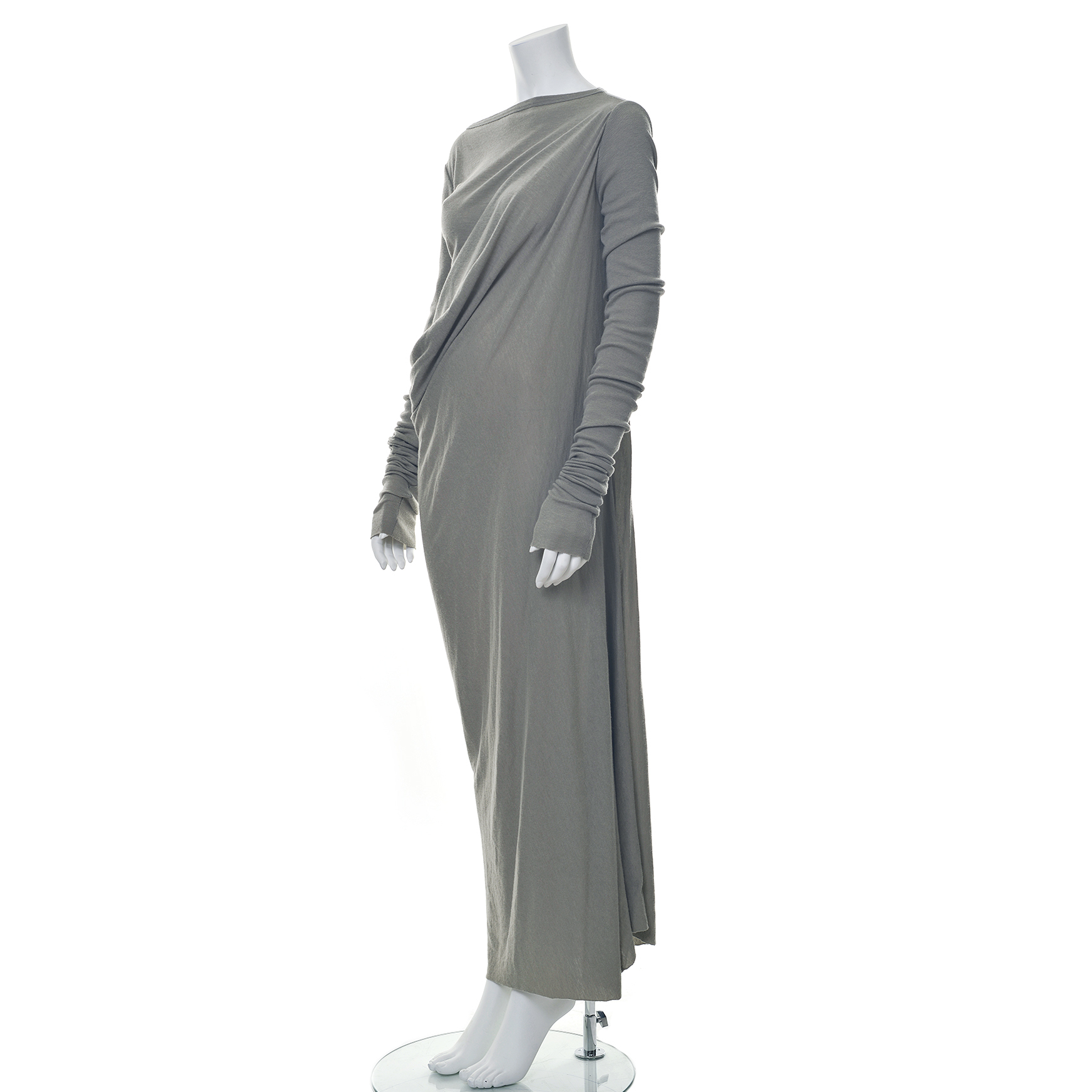 "Jasnoszara sukienka maxi , asymetryczna , z marszczeniami , długi rękaw. Wykonana z 30% wiskoza , 30% poliamid , 20% wełna 20% angora, rozmiar 36"