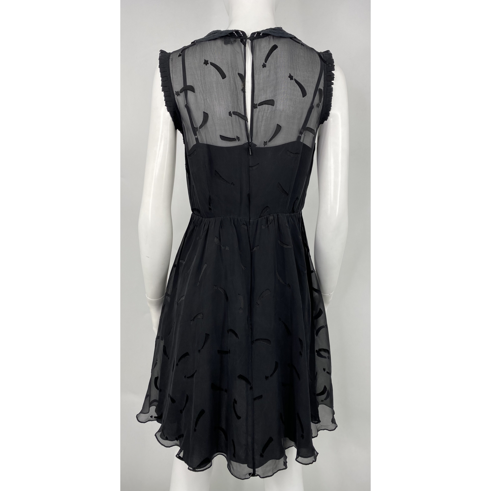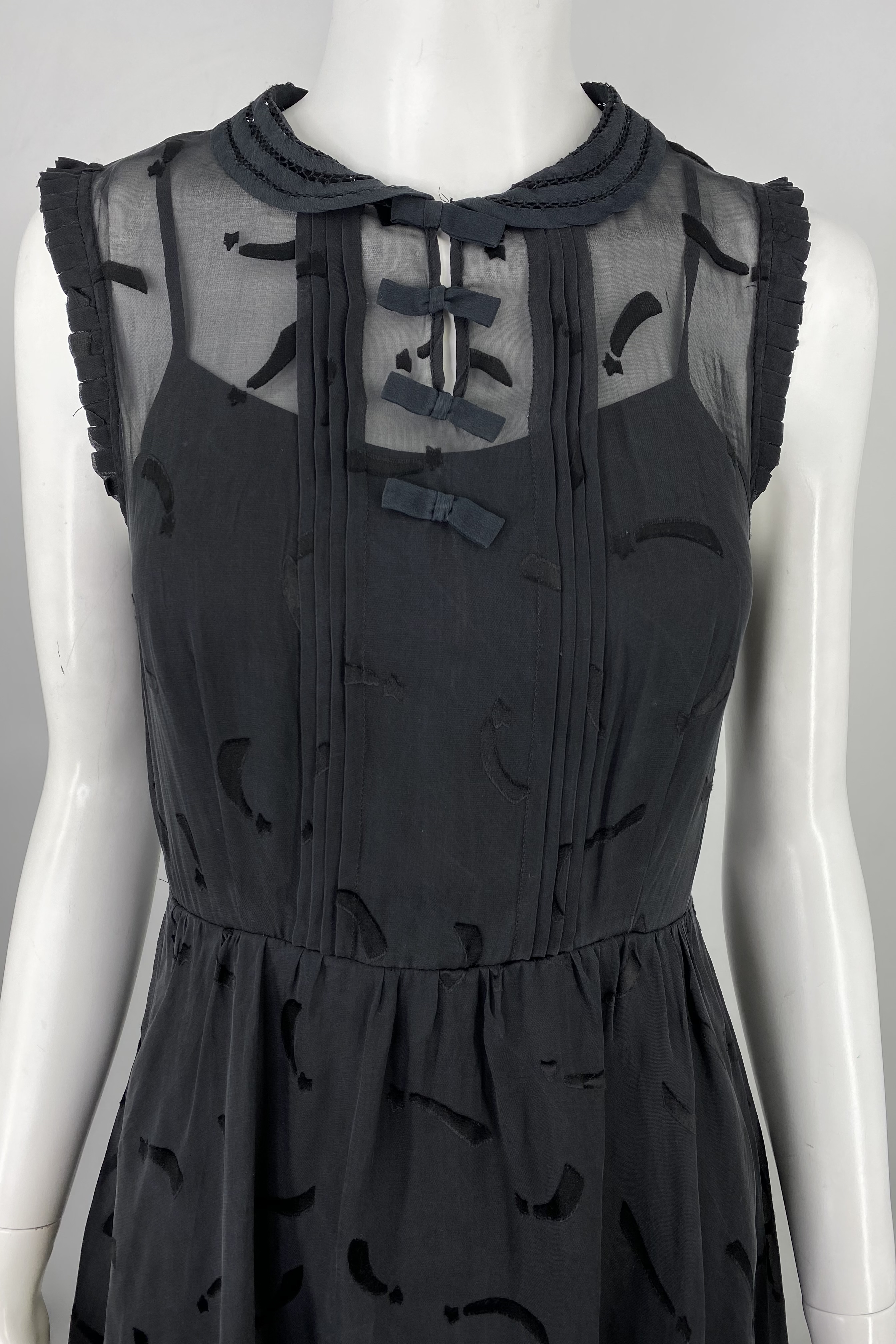 "czarna sukienka bez rękawów, we wzorki komet, odpinana halka, przy dekolcie rząd kokardek, ażurowe wykończenie przy stójce, roz. 10, skład: 85% jedwab, 15% wiskoza"