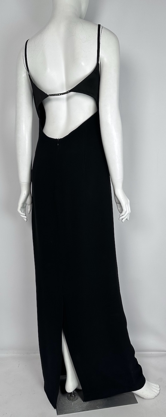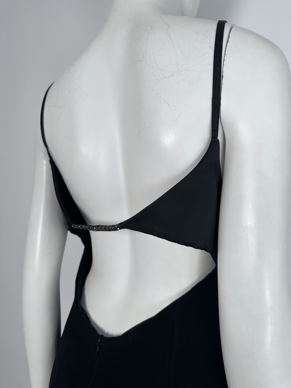 "Czarna sukienka na ramiączkach wykonana z łączonych materiałów, długość maxi, wykończona satynowym materiałem na wysokości biustu, dekolt typu serce, lekko taliowana, prosty krój, odkryte plecy, zapinana z tyłu na zapięcie wysadzane srebrnymi błyszczącymi kryształkami, suwak oraz haftkę, rozporek, częściowa podszewka. Rozmiar z metki IT 42. Skład: 100% acetat; materiał 2: 52% acetat, 48% wiskoza. Wymiary: szerokość mierzona do pachy do pachy 38cm, długość całkowita 153cm, szerokość w talii 38cm."