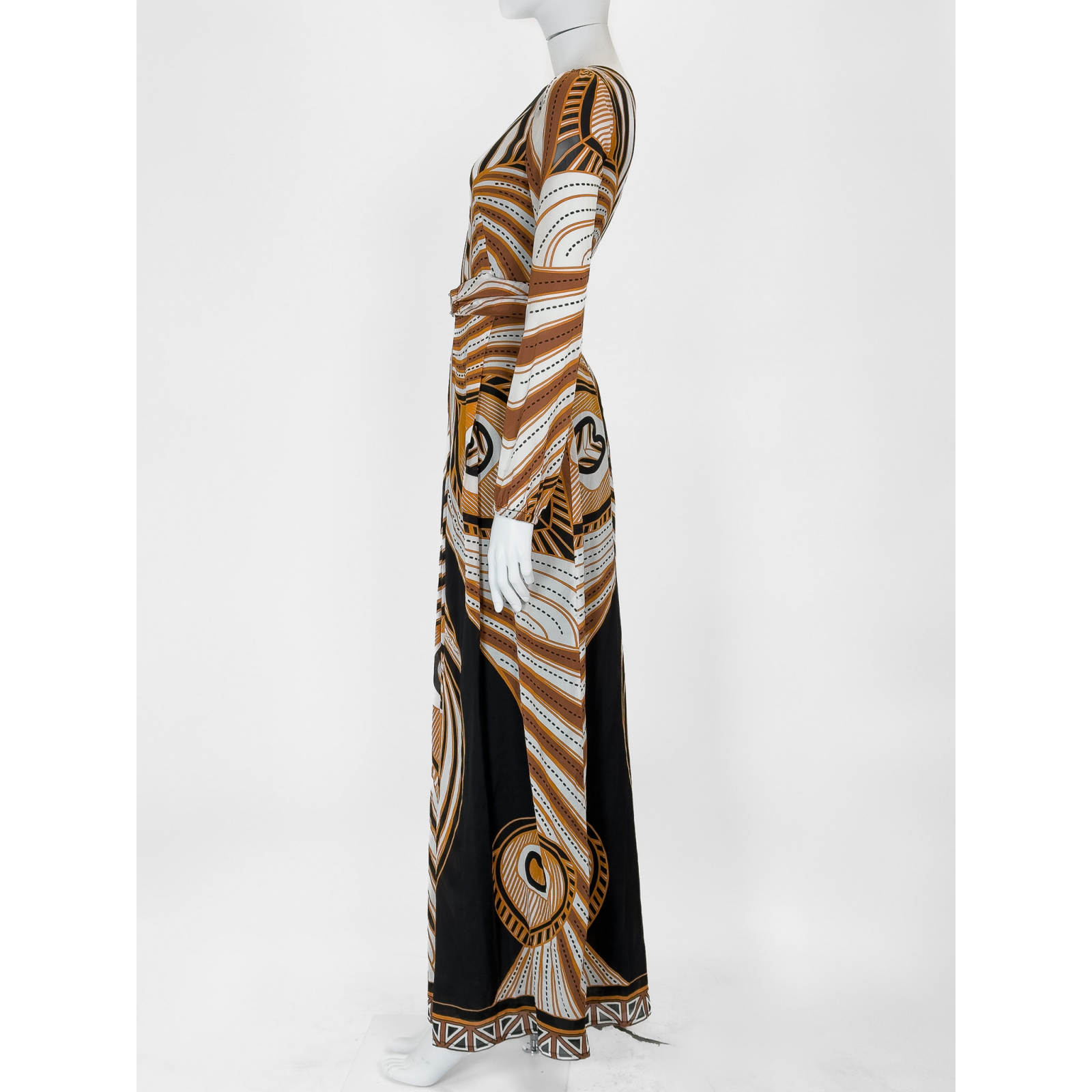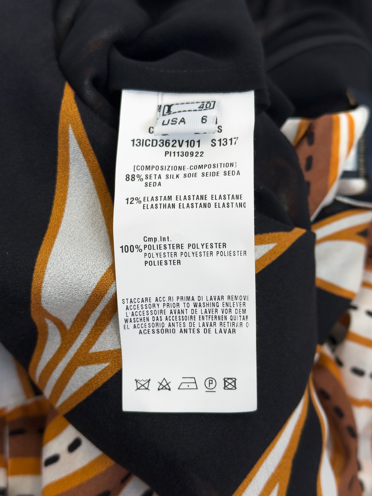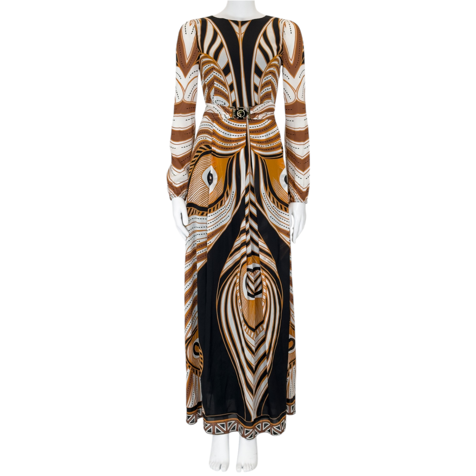 "Czarna jedwabna sukienka z długim rękawem w pomarańczowo- brązowo-białą grafikę z logo marki, długość maxi, zaokrąglony dekolt, bufiaste rękawy wykończone gumą przy mankietach, pasek w talii ozdobiony złotą grafiką węża, zapinana w tylnej części na kryty suwak oraz haftkę. Rozmiar z metki IT 40. Skład: 88% jedwab, 12% elastan. Wymiary: długość całkowita: 154cm, szerokość pod pachami: 41cm, w talii: 33cm, długość rękawa: 65cm."