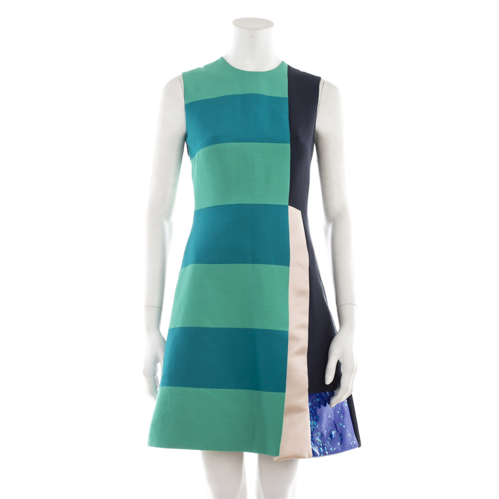 "Sukienka granatowa z elementami beżowo-turkusowych wstawek, w bardzo dobrym stanie, rozmiar M."