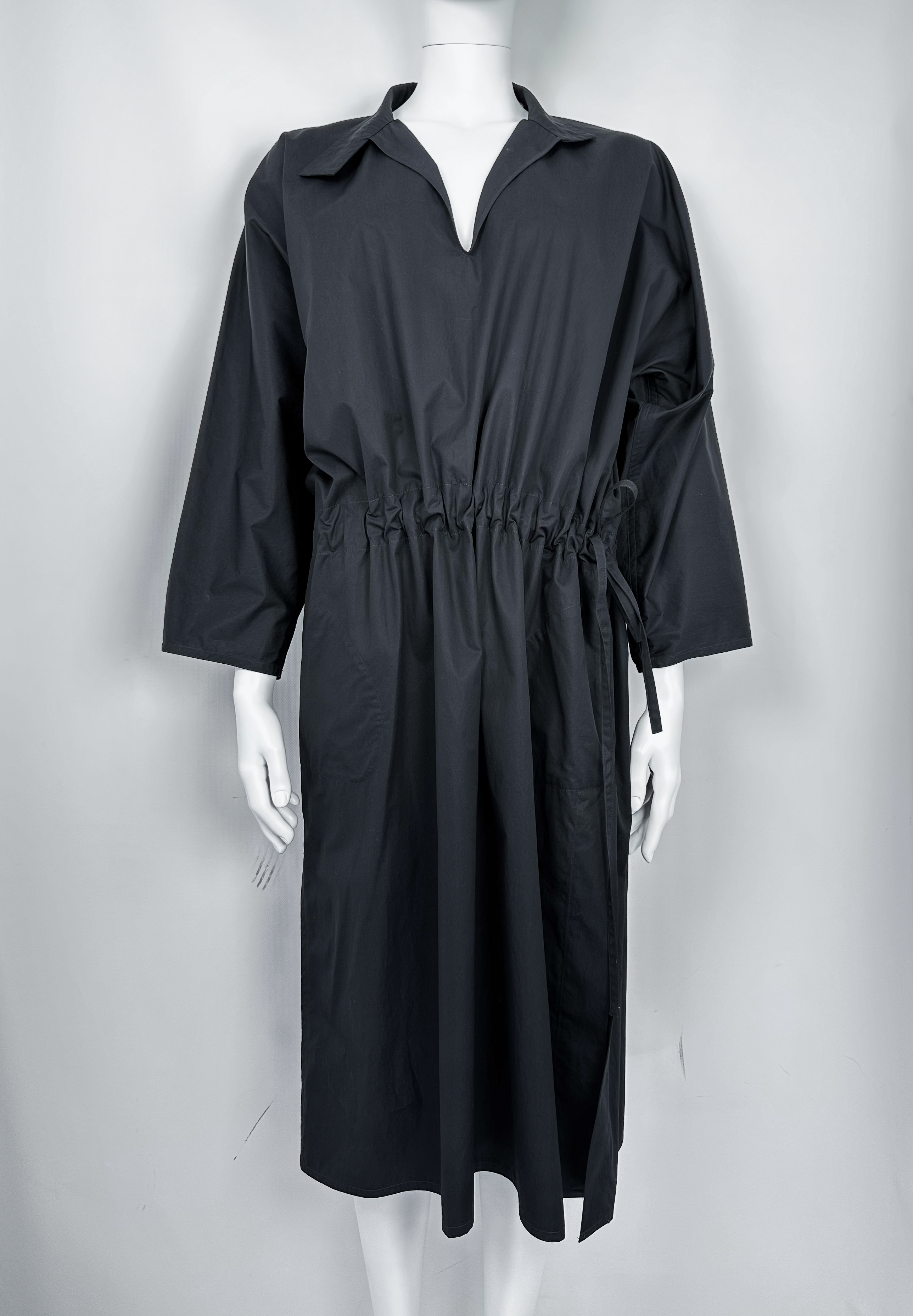 "Czarna bawełniana sukienka z długim rękawem, długość midi, głęboki dekolt w serek, obniżona linia ramion, zakładana stójka, taliowana, dwie kryte kieszenie po bokach, rozcięcie oraz wiązanie w bocznej części. Rozmiar z metki 38. Skład: 100% bawełna. Wymiary: szerokość mierzona od pachy do pachy 63cm, długość całkowita 115cm."