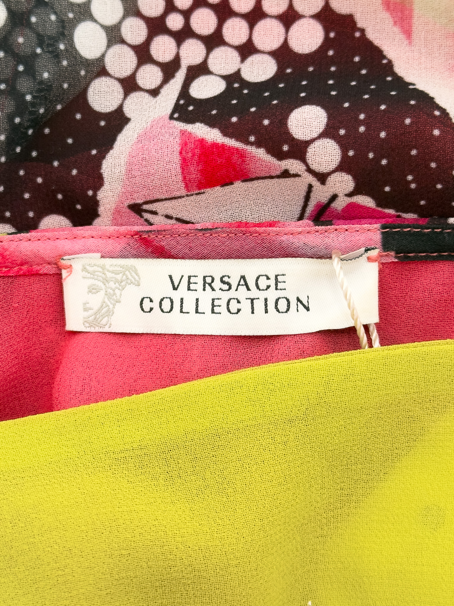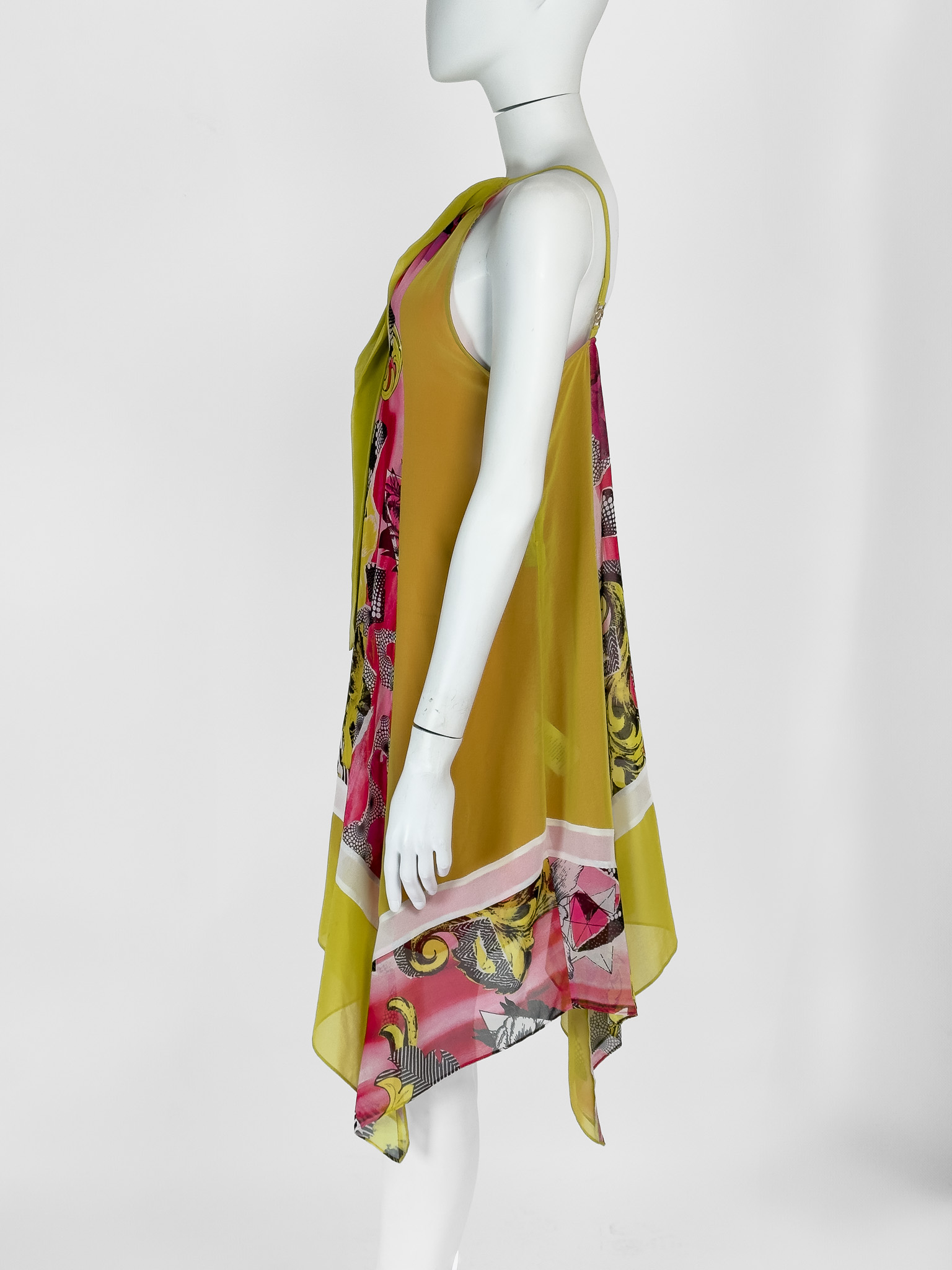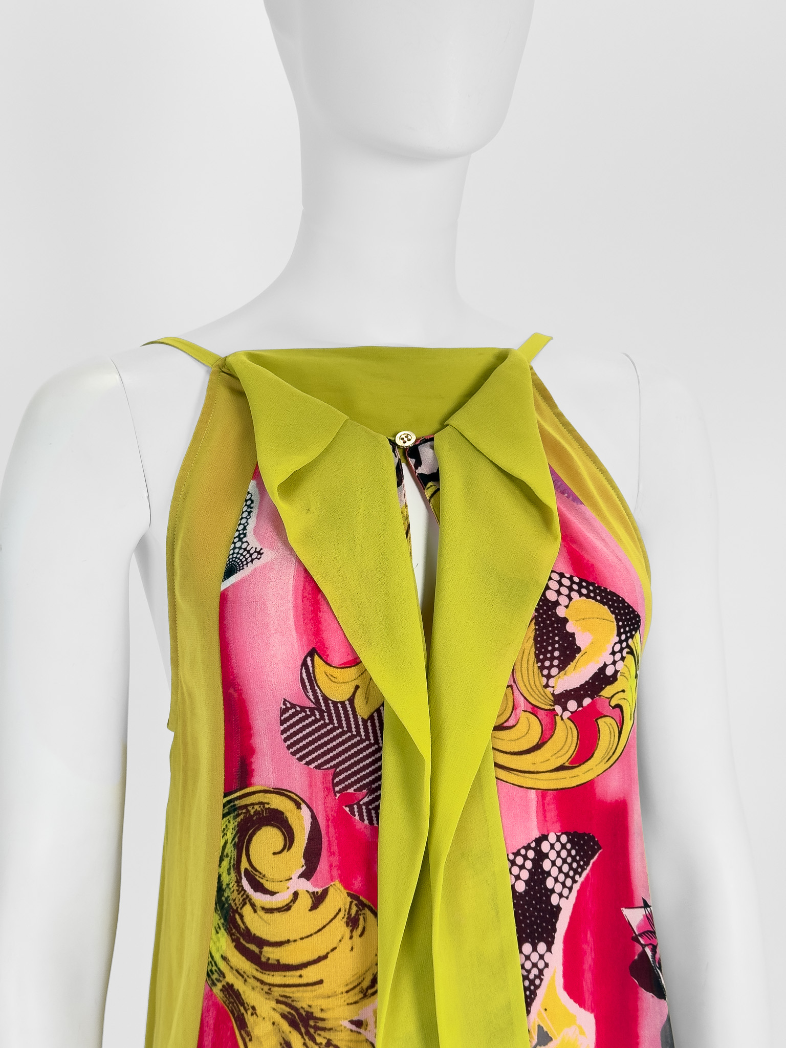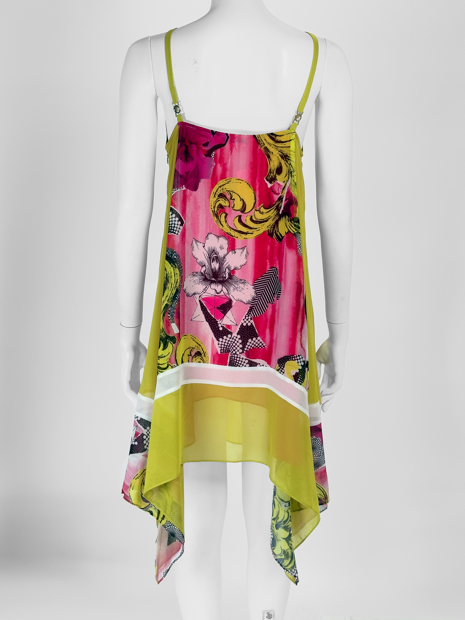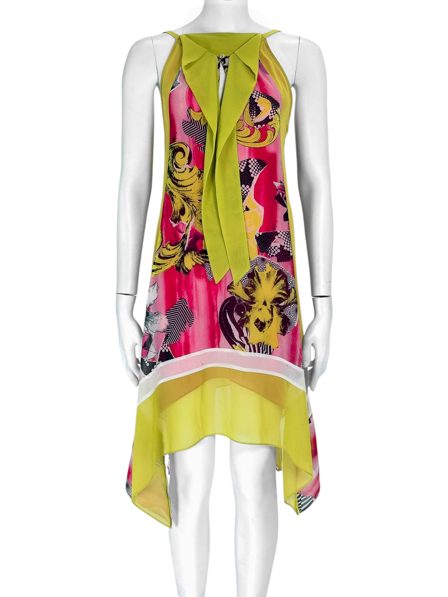 "Wielobarwna sukienka w kolorach limonki oraz różu, zwiewna z wiązaniem na przodzie, ramiączka posiadają złotą aplikację meduzy. Stan bardzo dobry. Rozmiar z metki IT 40. Skład: 100% poliester. Wymiary: szerokość mierzona od pachy do pachy 45cm, długość całkowita 116cm."