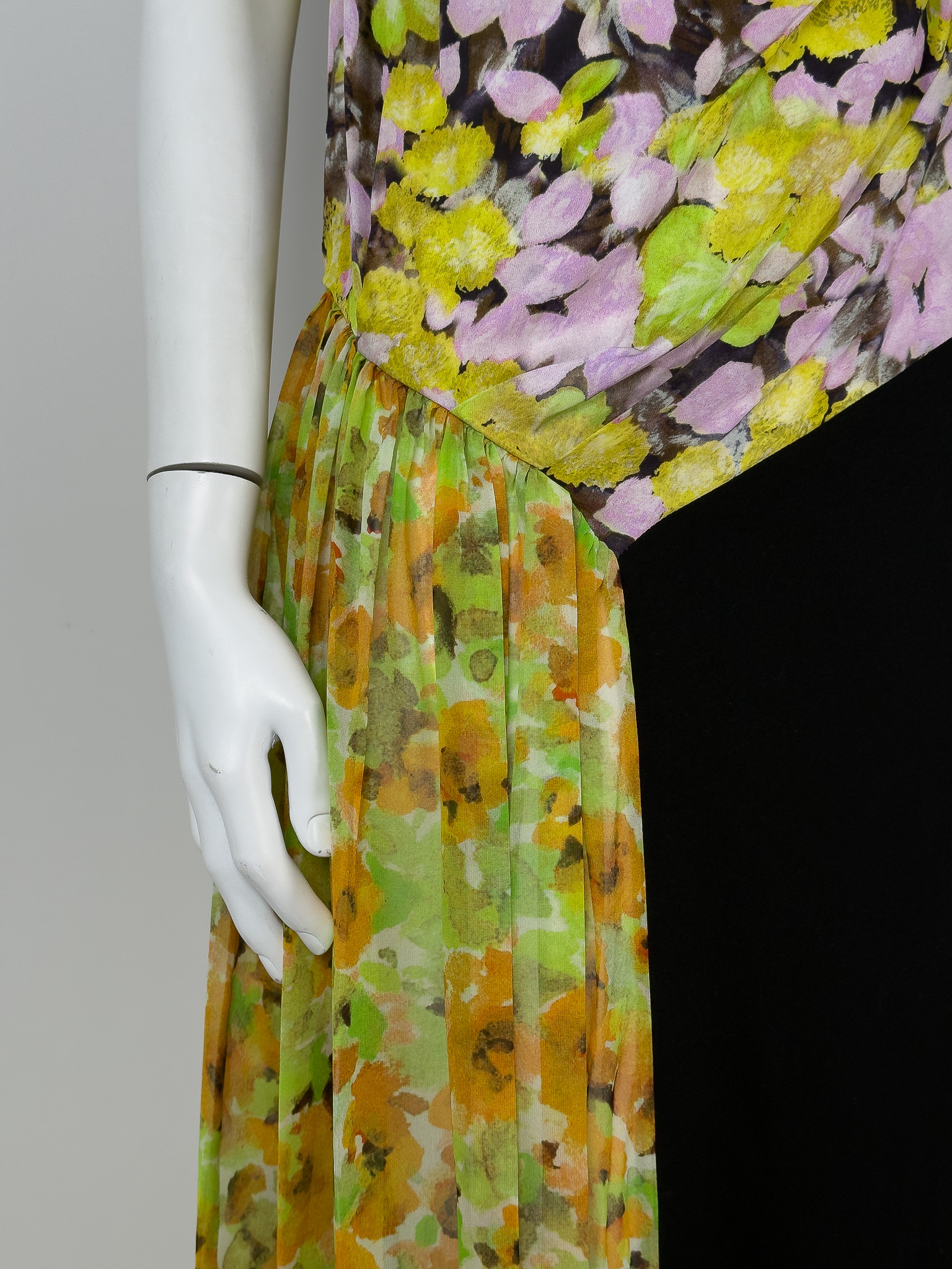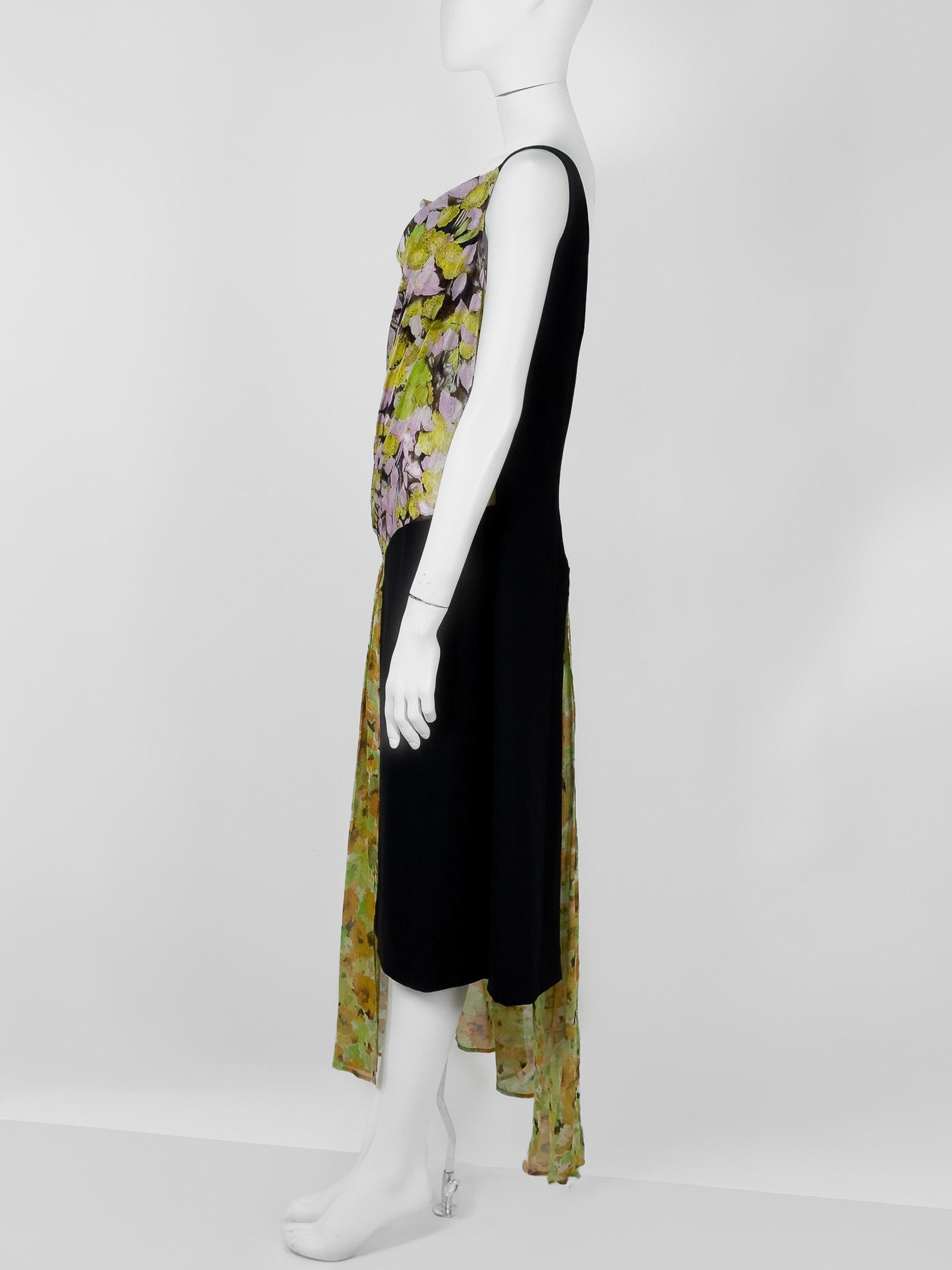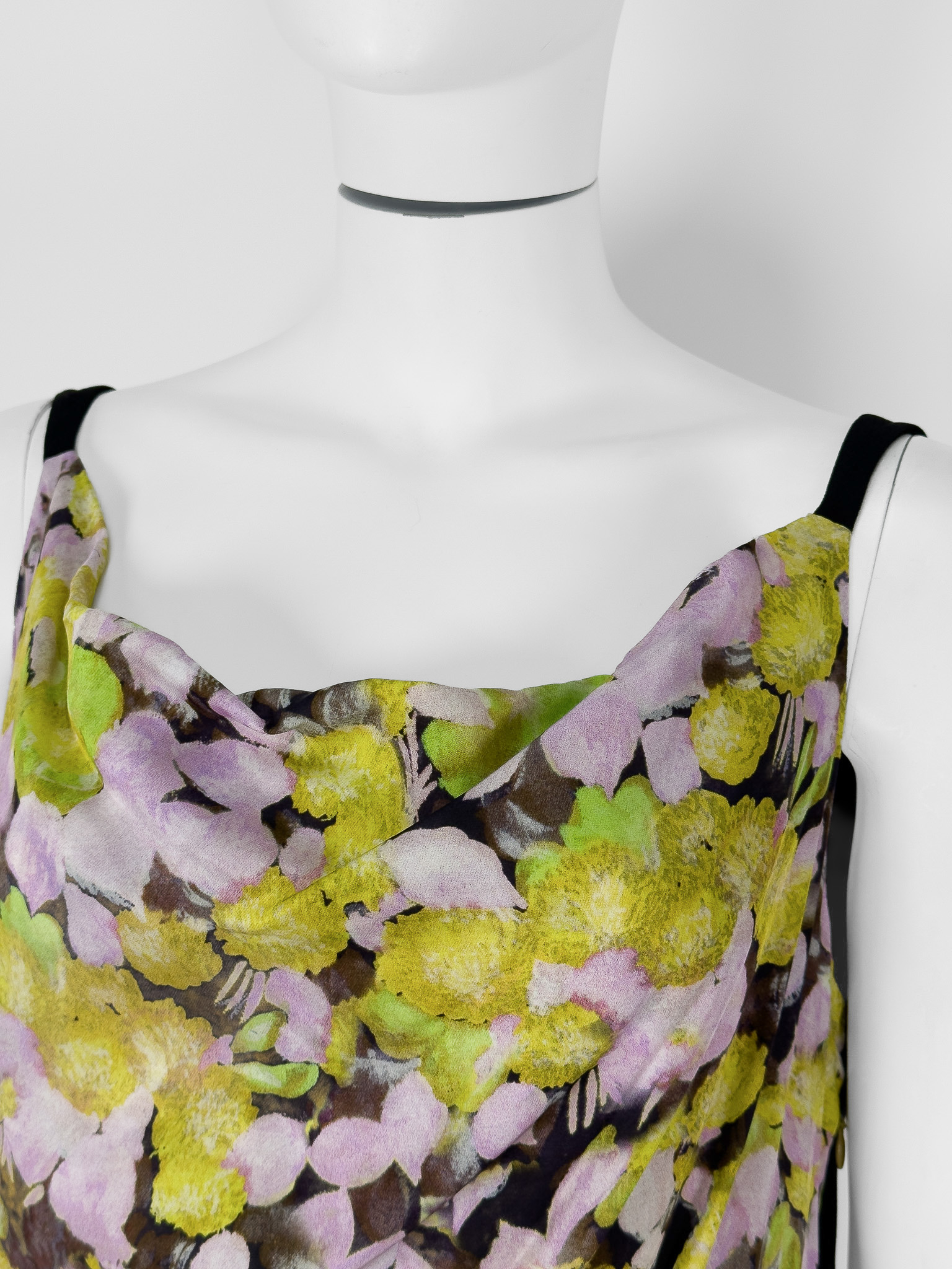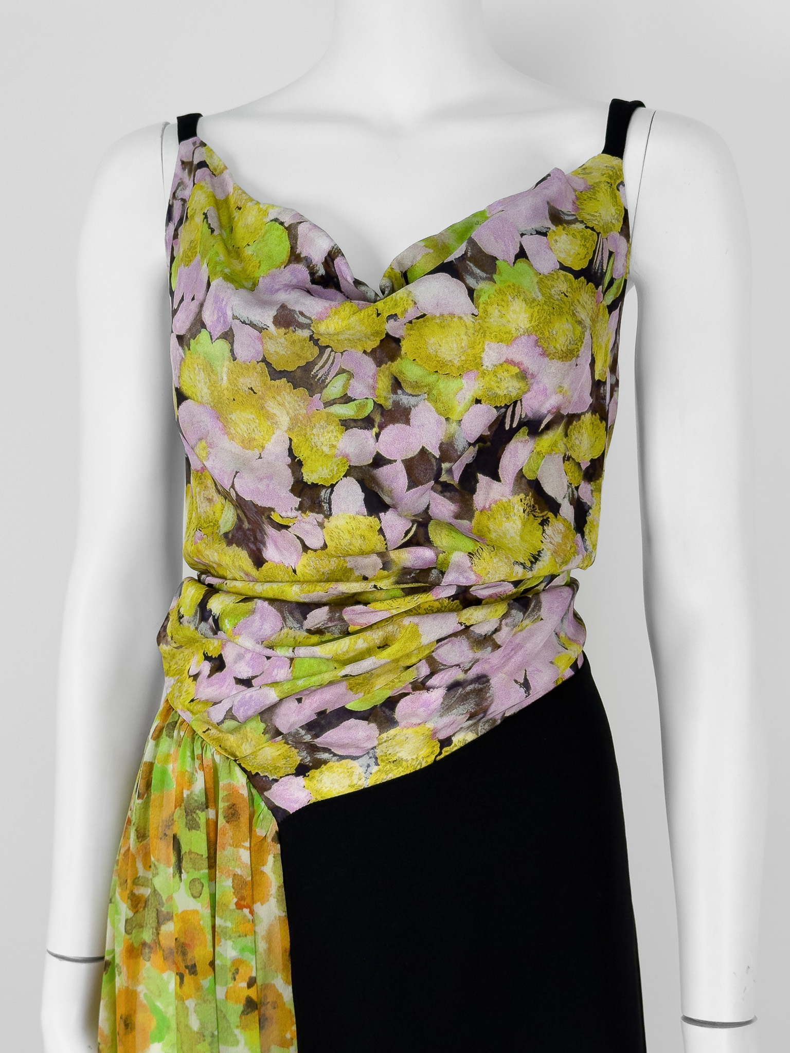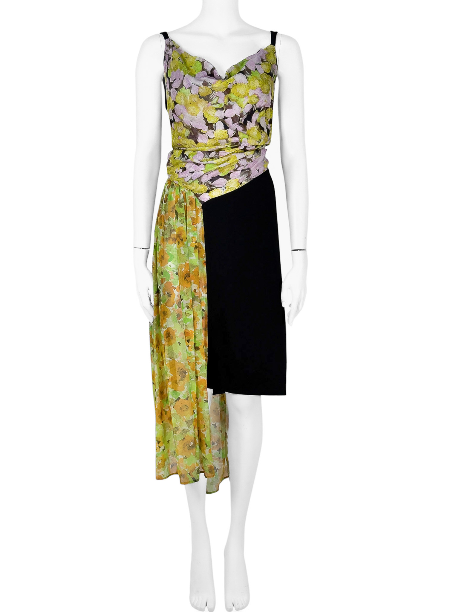 "Czarno - kwiatowa sukienka z domieszką jedwabiu w składzie, asymetryczna, na ramiączkach, zapinana na suwak, długość midi, lejący dekolt. Stan bardzo dobry. Rozmiar z metki EU 42. Skład: 51% jedwab, 30% poliester, 19% wiskoza. Wymiary: szerokość mierzona od pachy do pachy 50cm, długość całkowita 112cm.Kolekcja spring summer 2023"