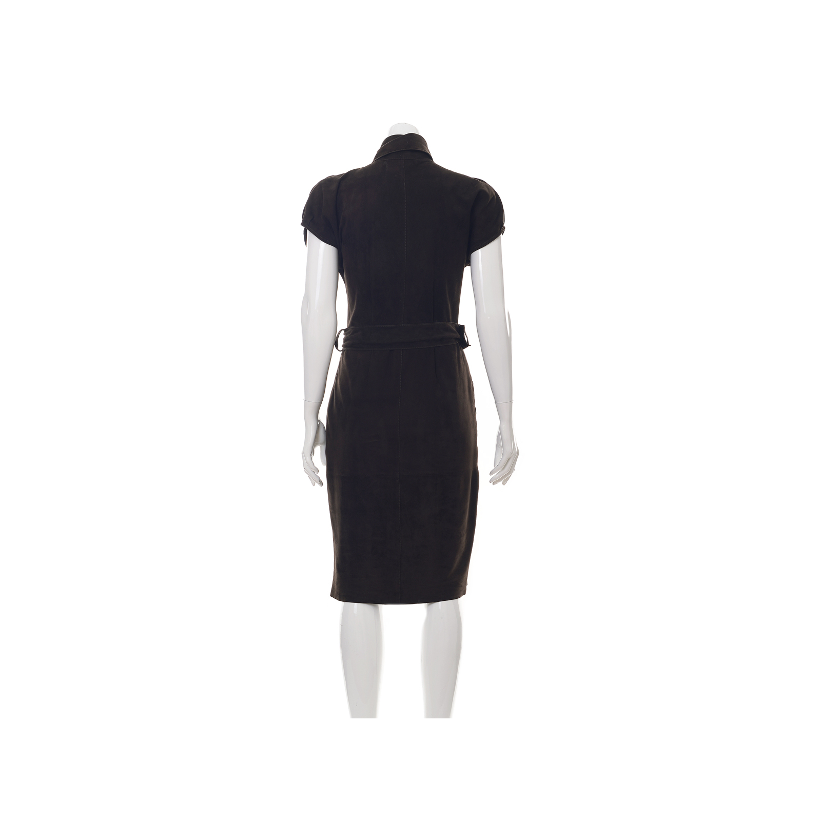 "Sukienka w kolorze brązowym, zamszowa, z paskiem, jak nowa, z krótkim rękawkiem"