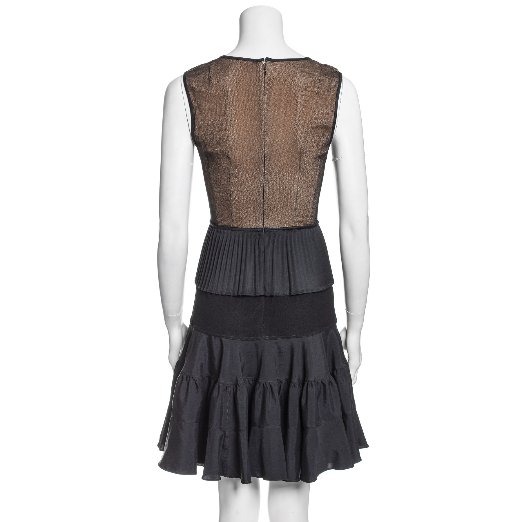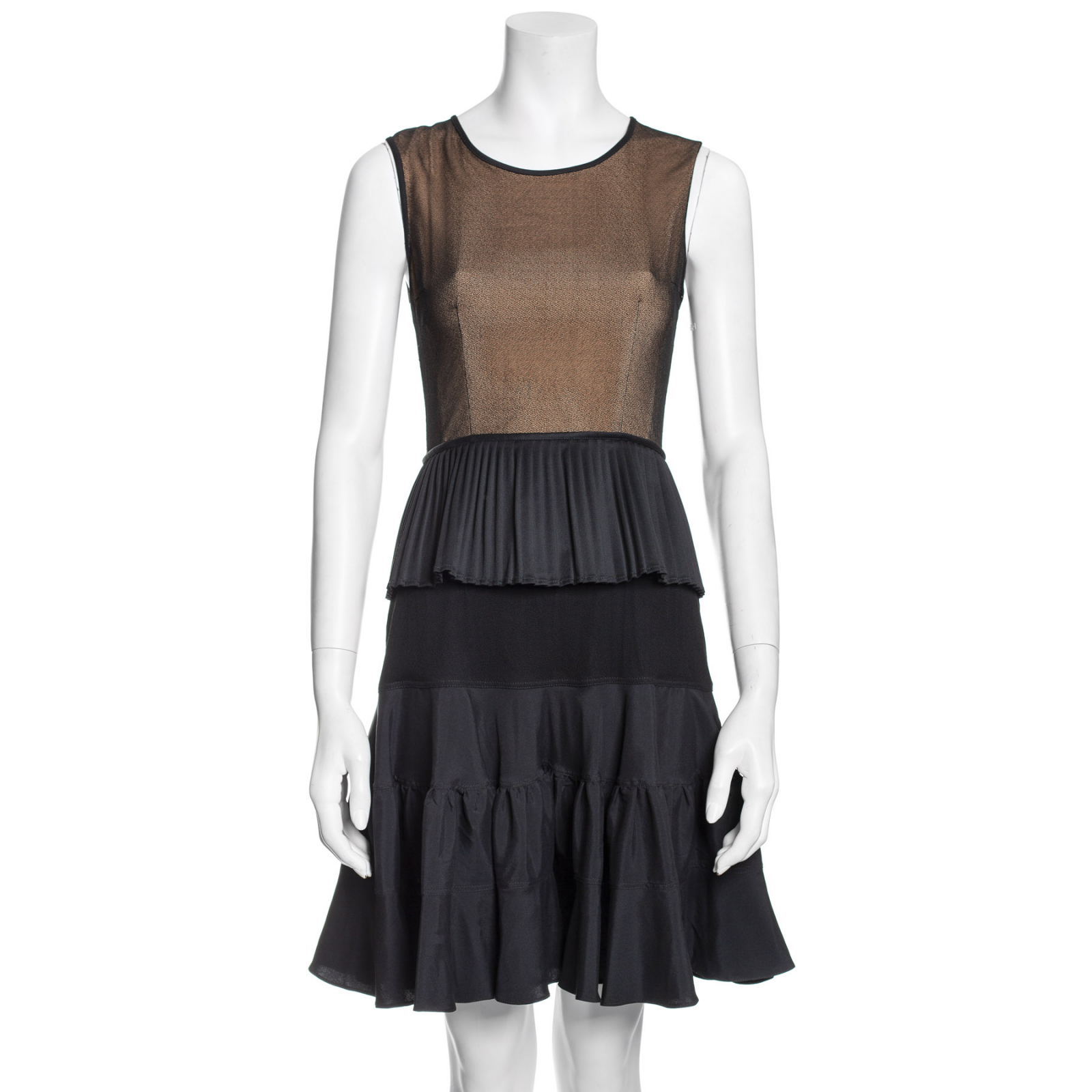 "Sukienka bez rękawów No Name (wycięta metka), na górze beżowa z delikatną siateczką od pasa warstwy materiałów, plisy i falbany"