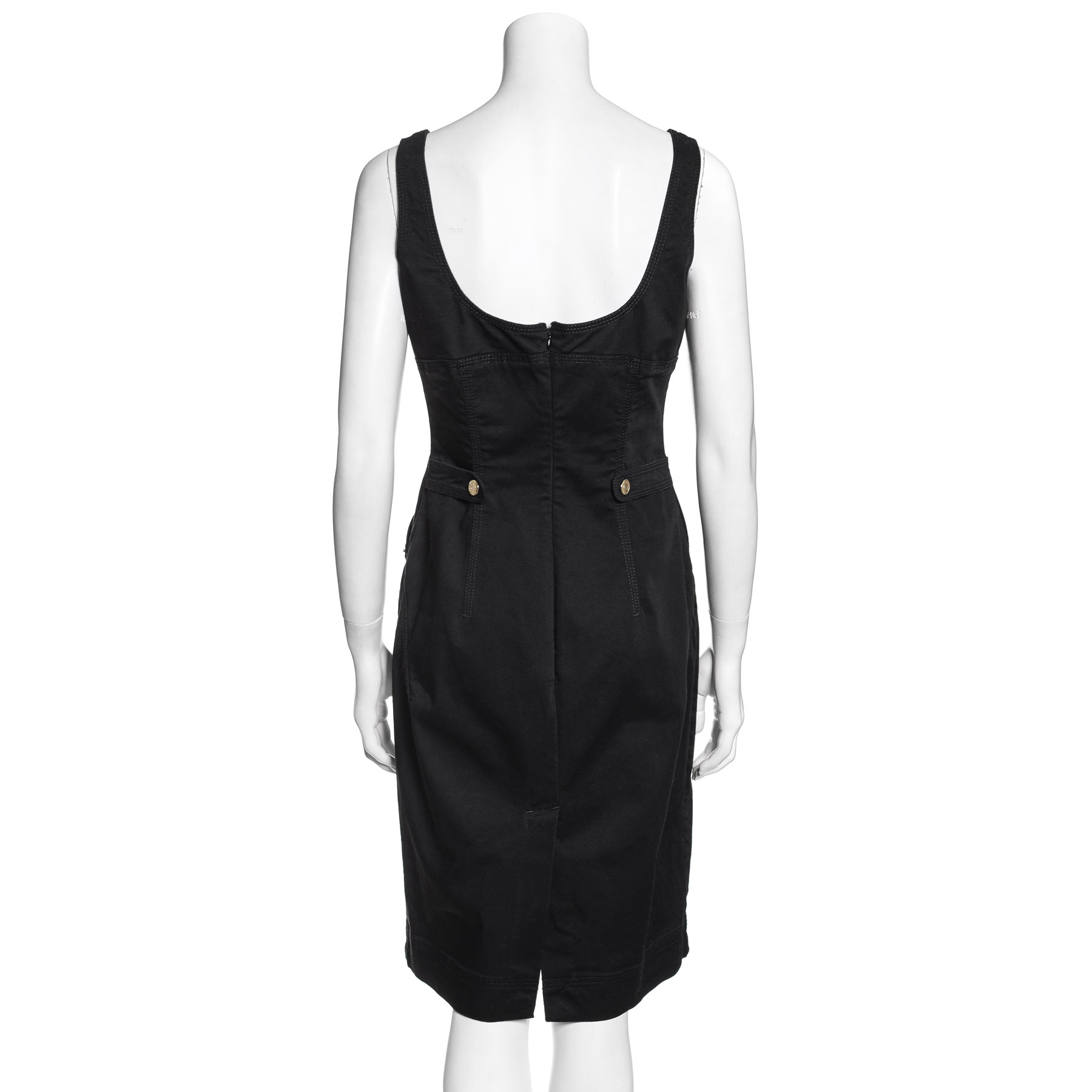 "Czarna sukienka na ramiączka, pasowana, zapinana na suwak. Z kieszeniami na przodzie. Wykonana z 98% bawełny i 2% elastanu. Rozmiar 44(it)"
