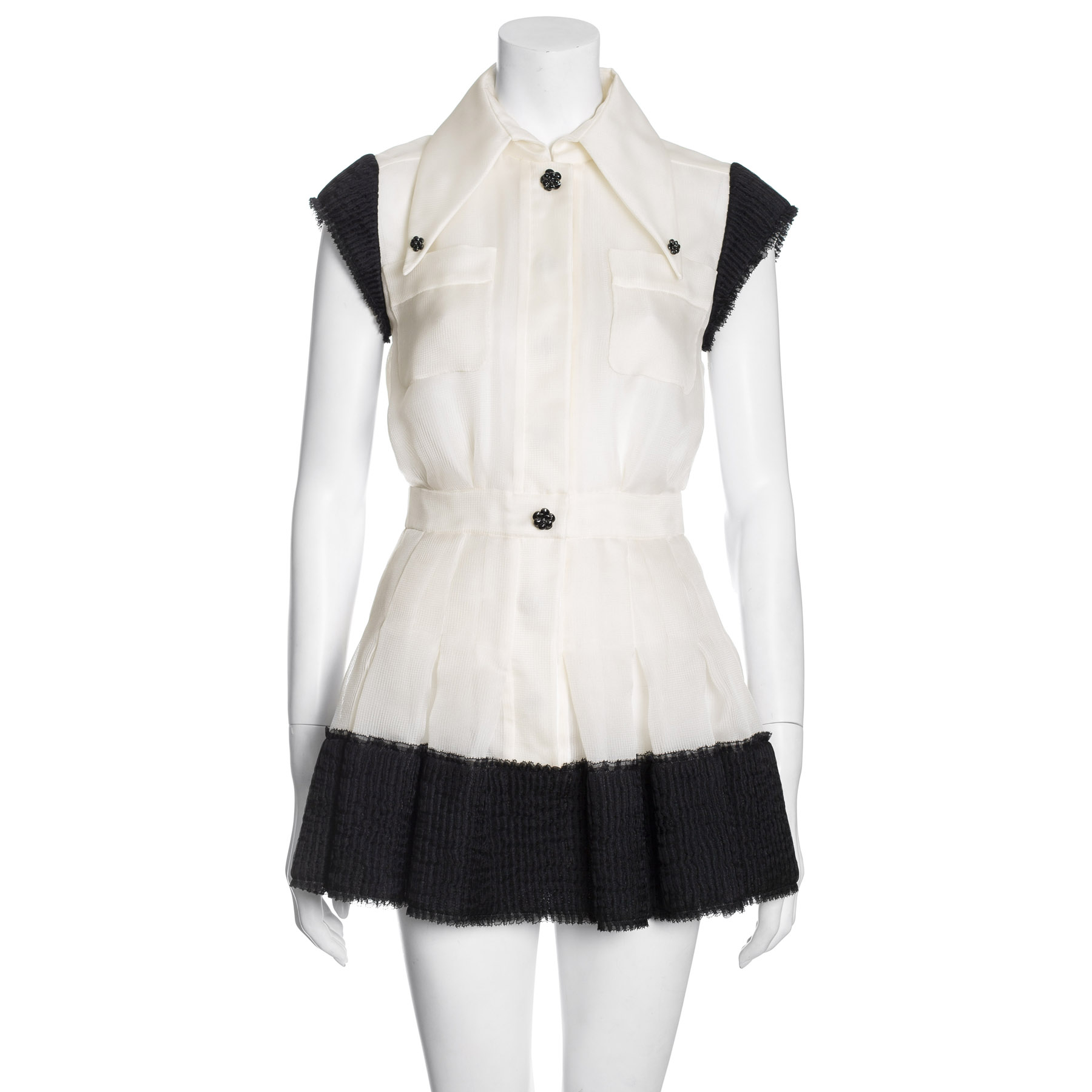 "Biała koszulowa sukienka, krótki rękawek, zakończona czarnym marszczonym pasem, długi kołnierz z czarnymi guzikami, kieszonki, rozmiar 34; skład: 100% jedwab; wymiary: ramiona 48 cm, biust 41 cm, talia 34 cm, długość całkowita 80 cm"