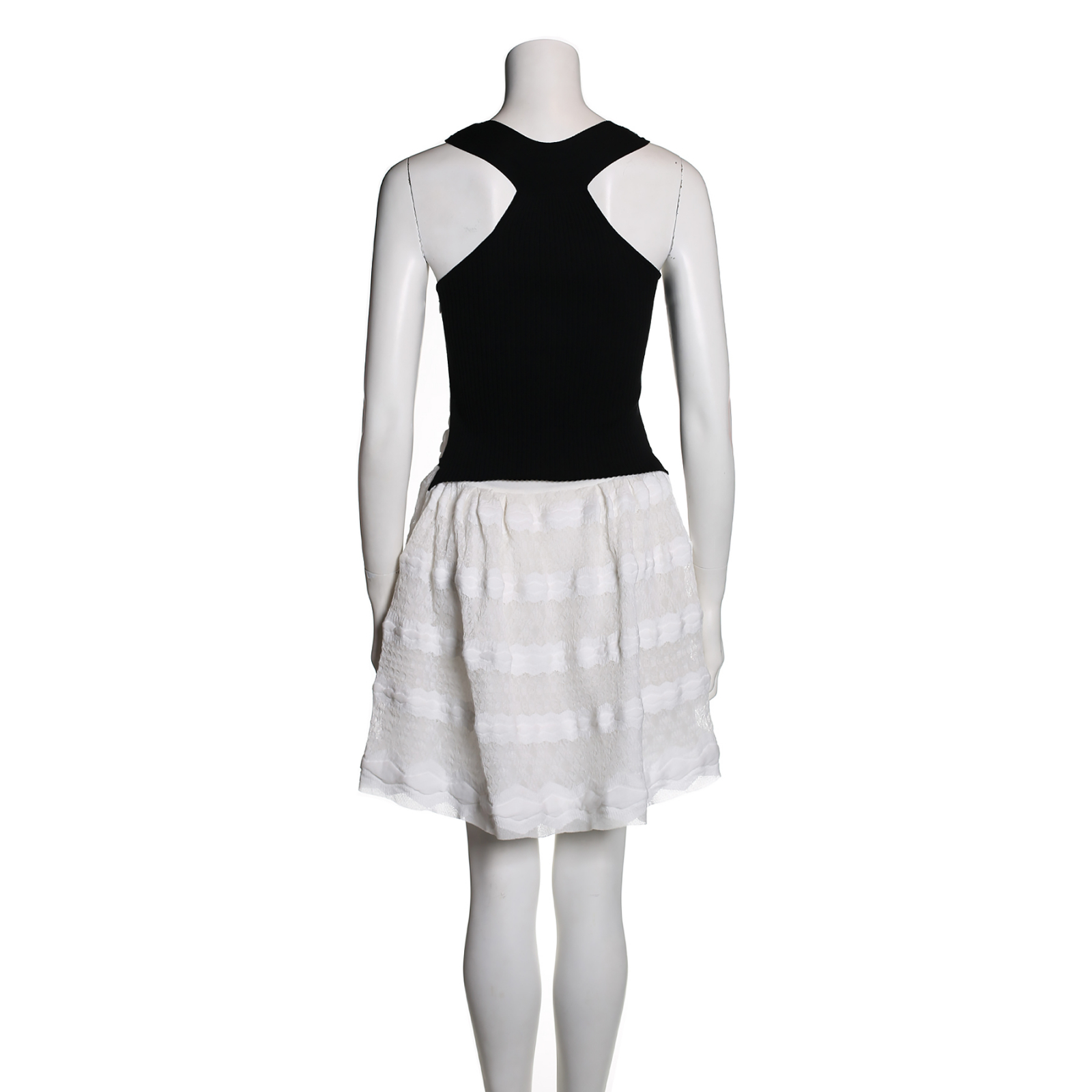 "Biała sukienka bez rękawów, dzianinowa, rozkloszowany dół, tłoczona, z tyłu czarny prązkowany materiał. Rozmiar 34, skład 33% bawełna 26% polipropen 23% viskoza 12% poliamid 6%poliester