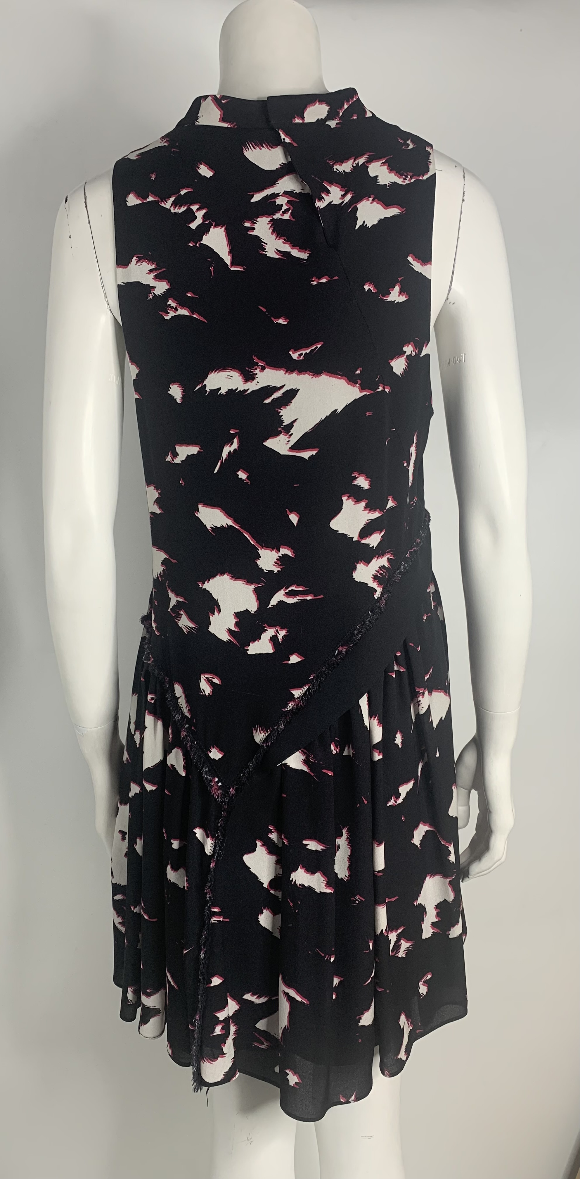 "Czarna sukienka bez rękawów w różowo białe wzory, z tyłu zapinana na guziczki, dł całkowita 91cm, szer biust 45cm, 100% jedwab, rozmiar z metki 6"