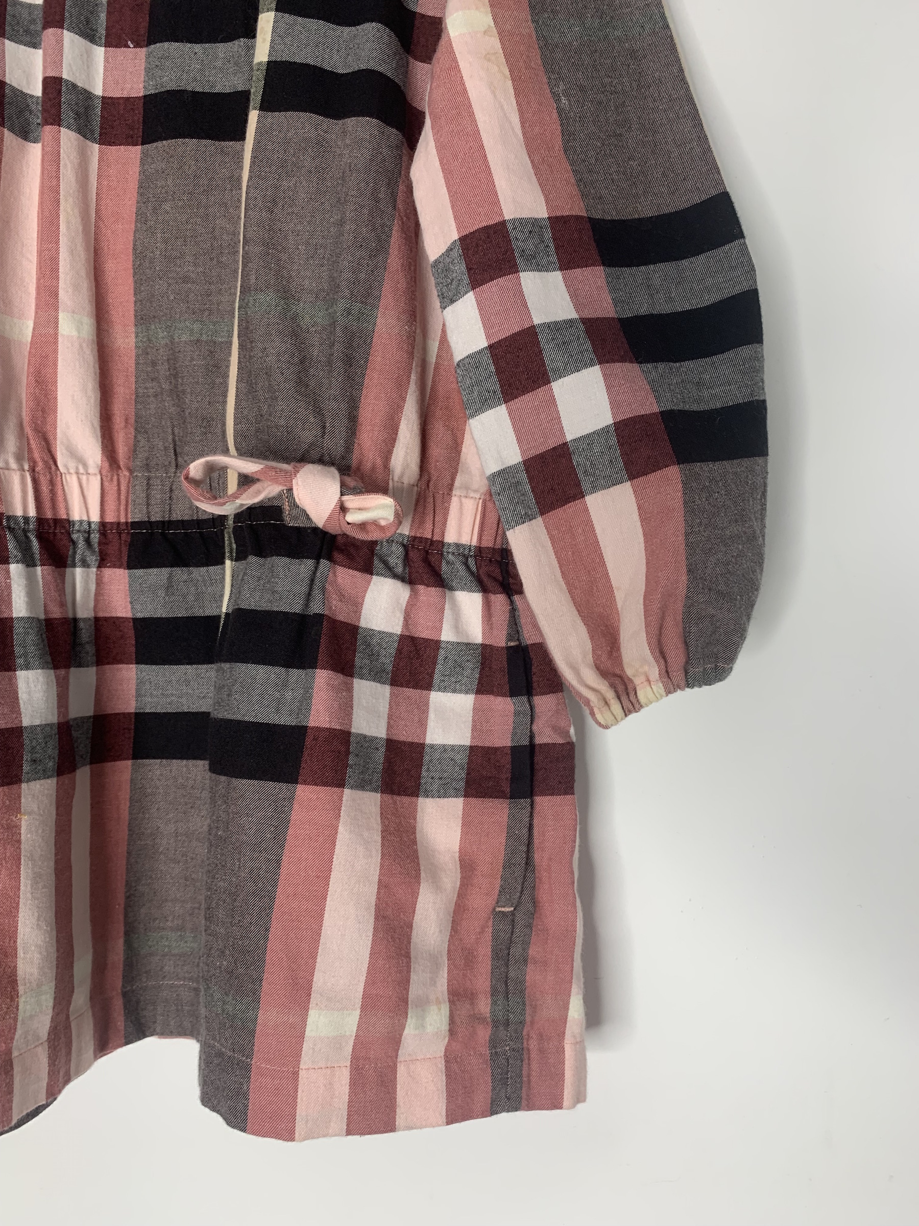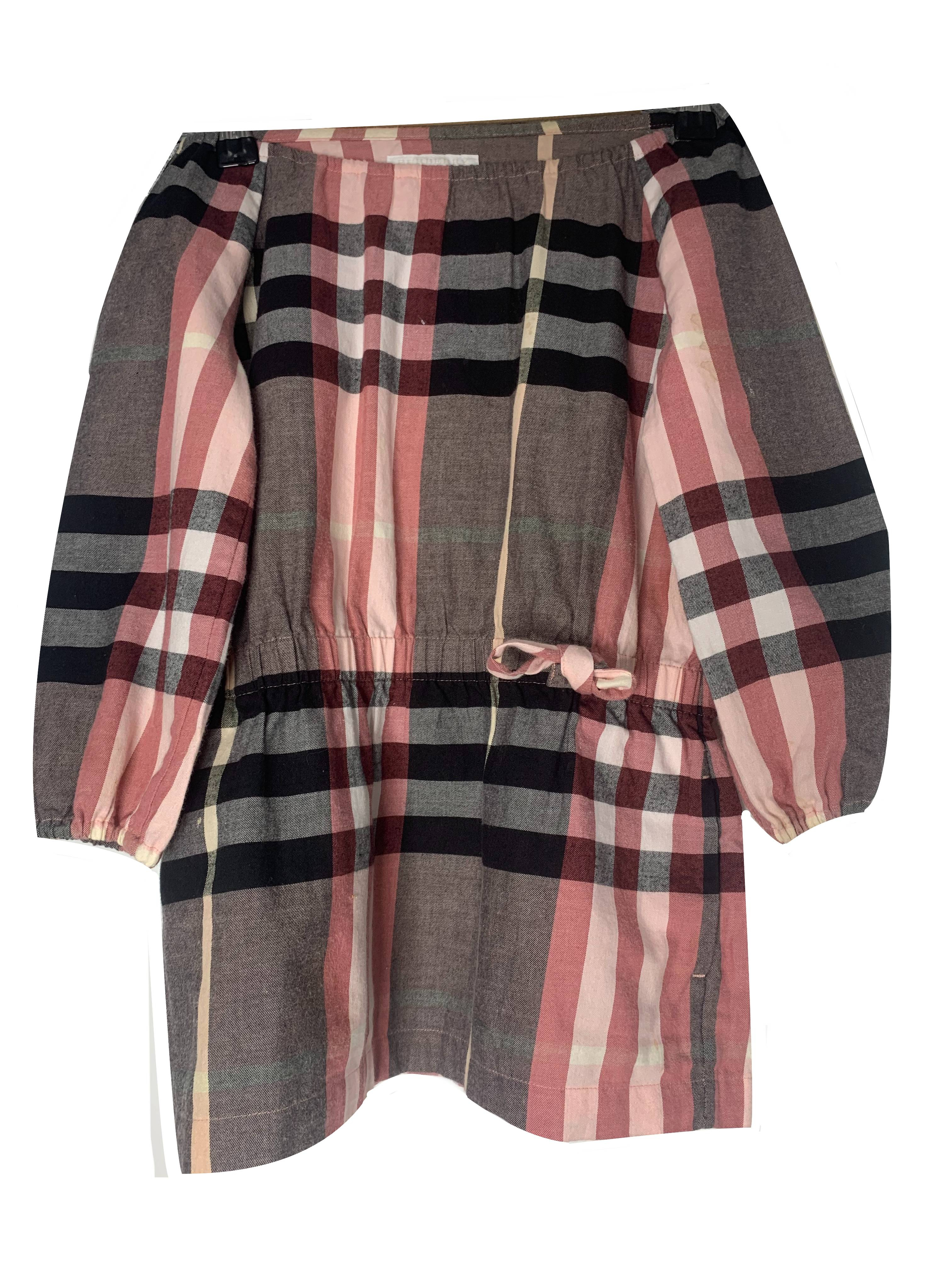 "flanelowa SUKIENKA/TUNIKA na gumce, dekolt hiszpanka, w różowo-szaro-biało-czarną kratę, 4y, małe plamki, dł całkowita 53cm, szer klatka 40cm, dł rękaw 38cm, 100% bawełna"