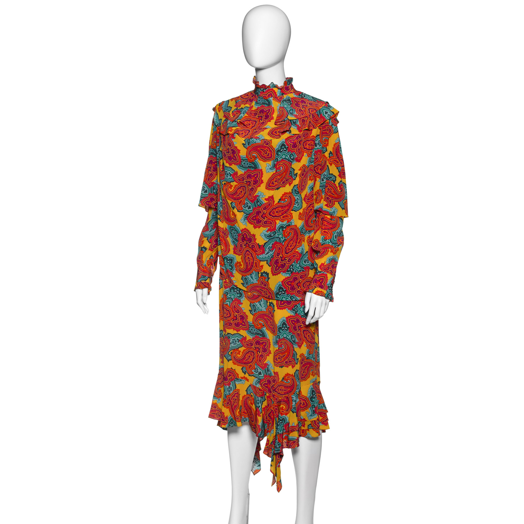 "Sukienka maxi żółta w kolorowy wzór paisley, z półgolfem w formie falbanki. Na dole sukienki i na rękawach falbanki. Zapinana z tyłu na duży suwak. Rozmiar 38. Skład: 100% jedwab. Wymiary: ramiona 41 cm. biust 48 cm talia 49 cm. dł. rękawów 64 cm. długość 111 cm."