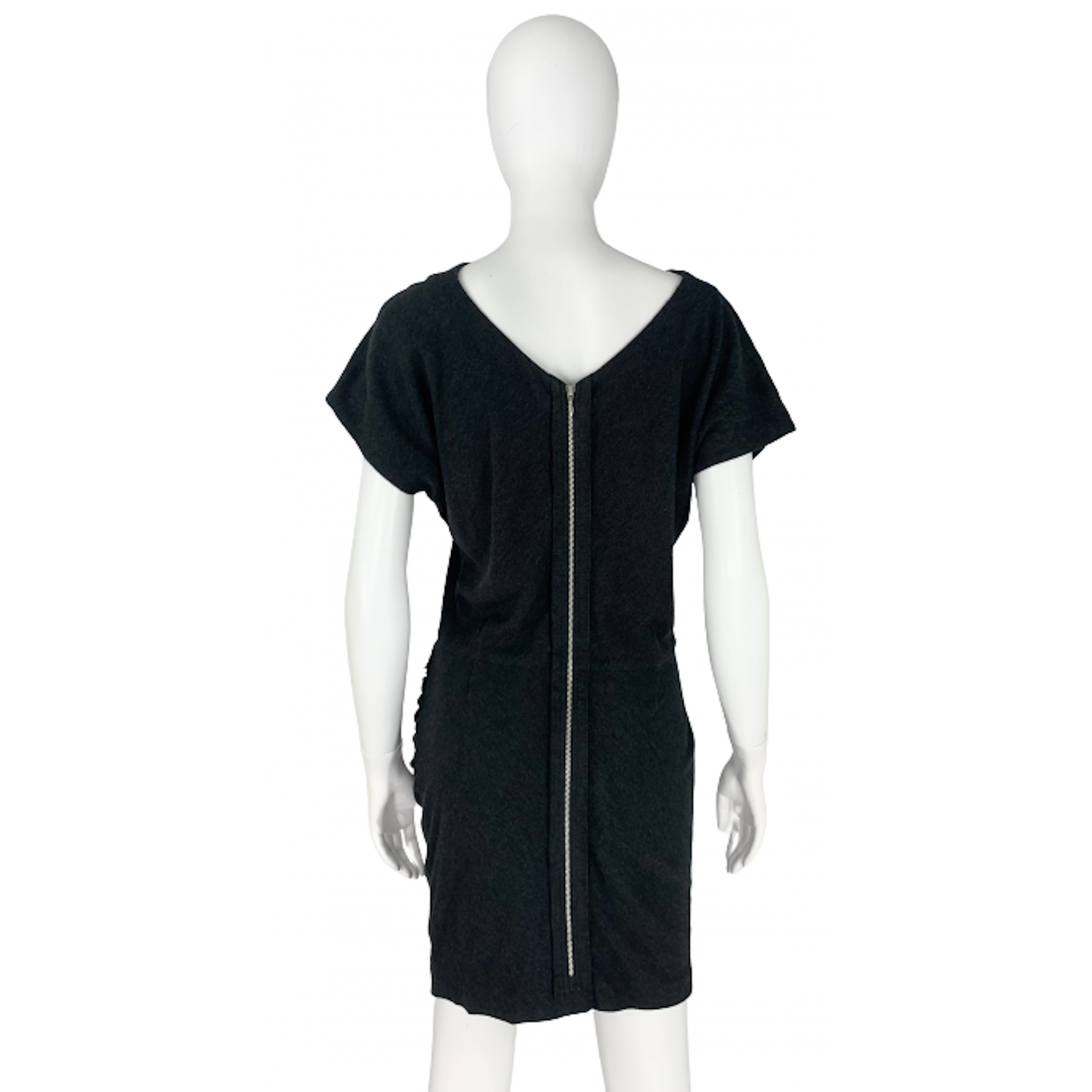 "szara dzianinowa sukienka, marszczona z boku, odcinana w pasie, z tyłu zapinana na srebrny suwak po całości, rozmiar 36, skład 60% akryl, 20% rayon, 9% poliamid, 3% angora Wymiary: dł. całkowita 93cm, szer. talia 38cm, szer. biust 50cm"