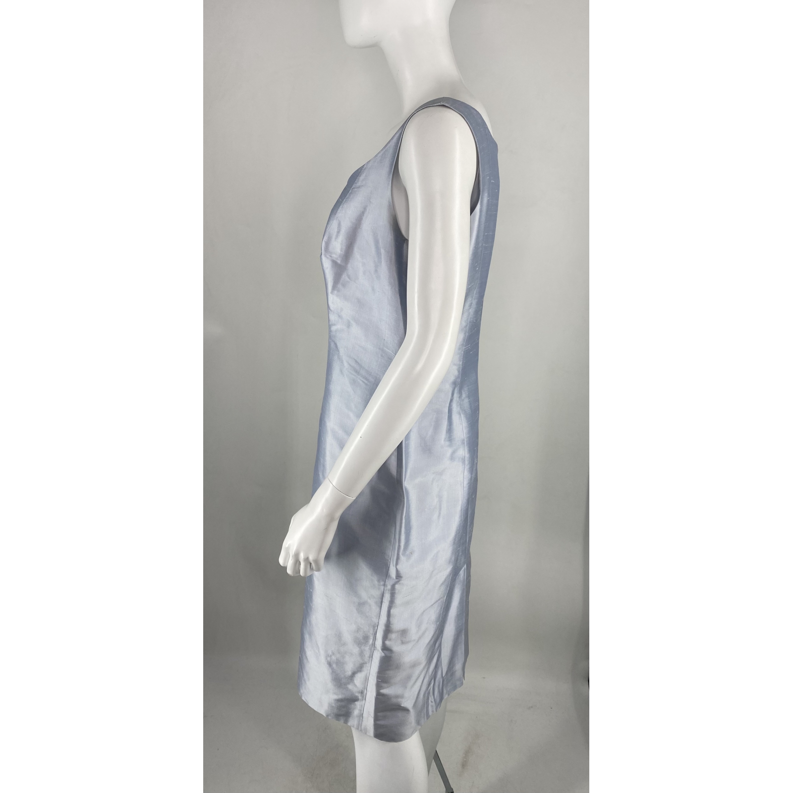 "błękitna sukienka z szantungu princeska do kolan, brak metki ze składem,dopasowana, suwak z tyłu, roz. 42. Wymiary: dł. całkowita 100cm, szer. biust 47cm, szer. talia 42cm, szer. biodra 51cm"