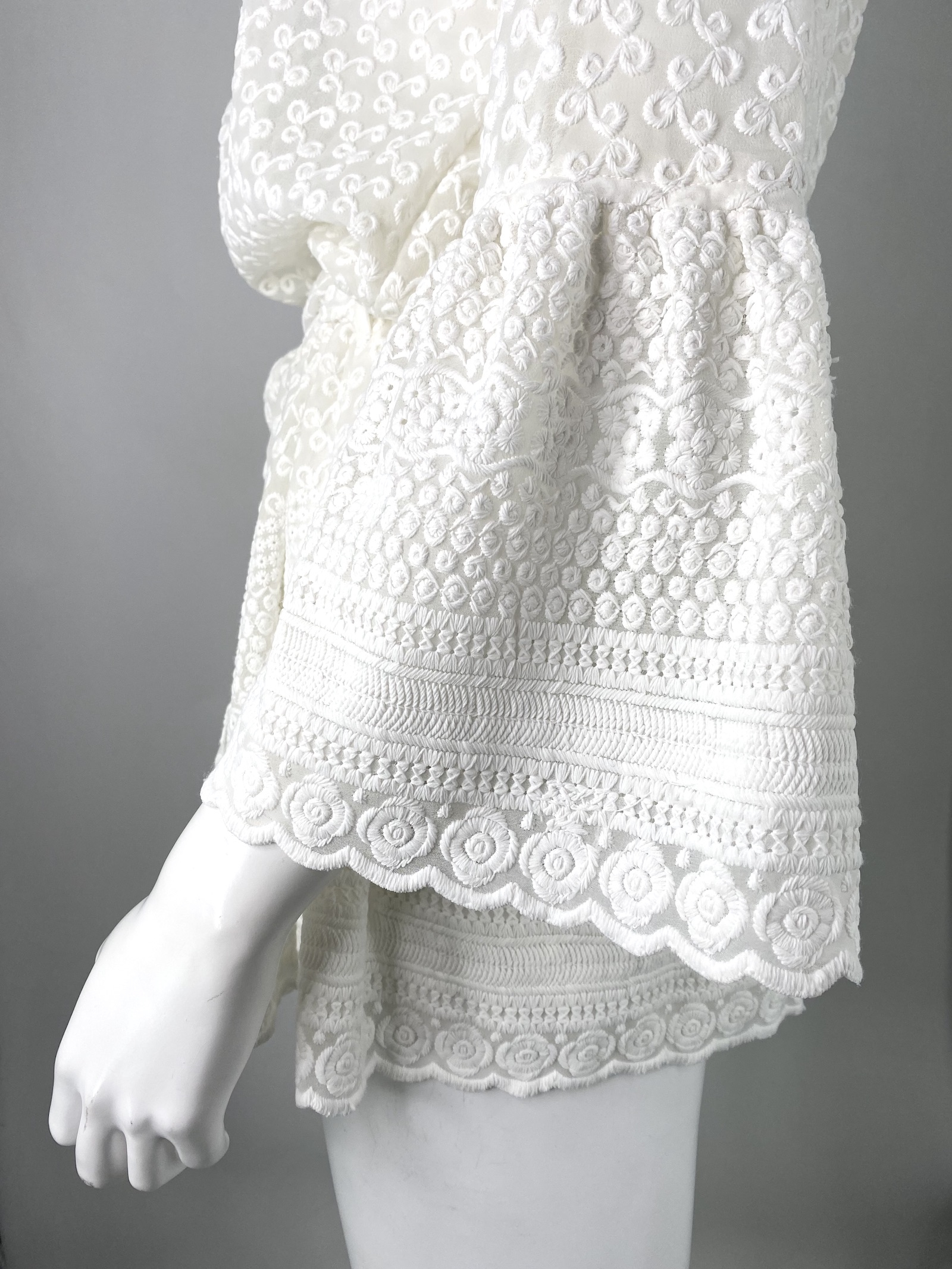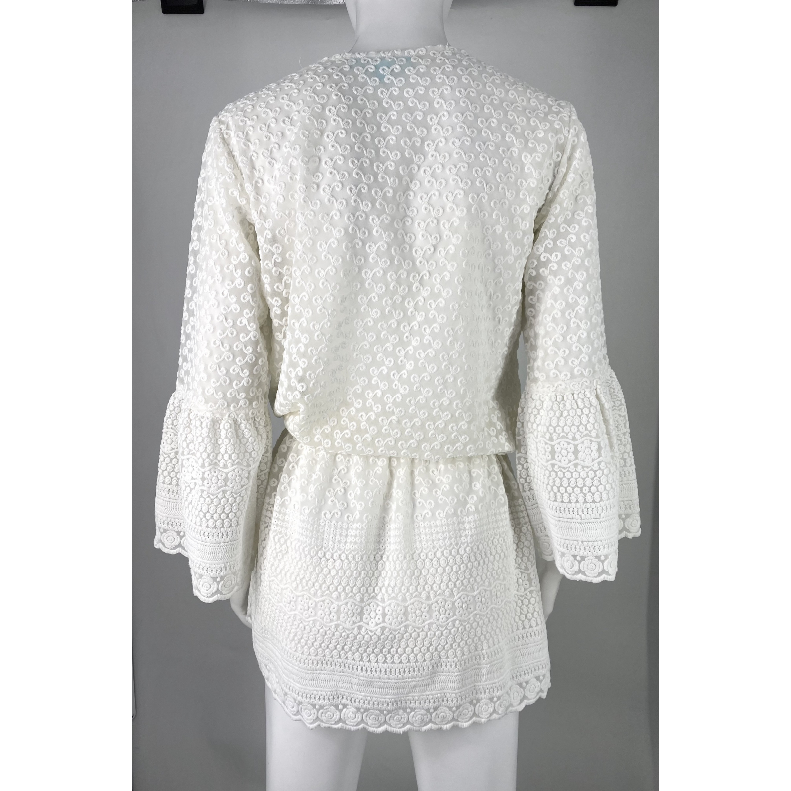 "biała koronkowa krótka sukienka/tunika transparentna z rozkloszowanym rękawem 3/4, dekolt w szpic, gumka pasie oraz wiązanie. Rozmiar XS. Wymiary: dł. całkowita 82cm, szer. biust 48cm, dł. rekaw 46cm"