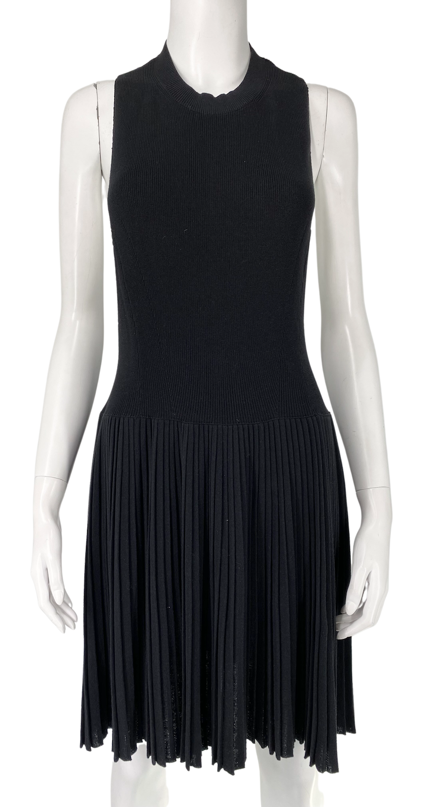 "sweterkowa sukienka bez rękawów, wycięcia na łopatkach, rozkloszowana z plisami, roz.S. Wymiary: dł. całkowita 98 cm, szer. biodra 40 cm."
