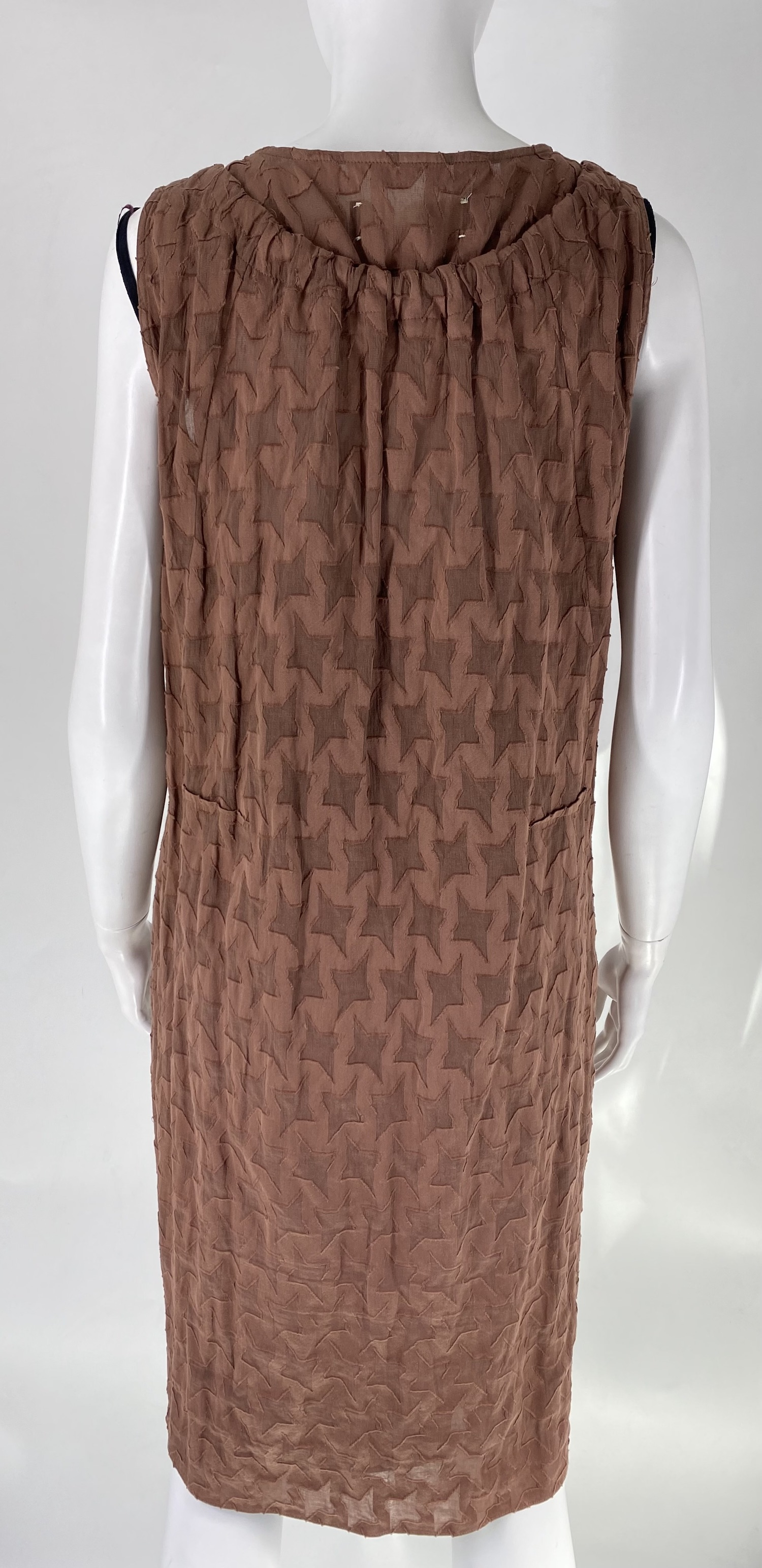 "Brązowa sukienka bez rękawów z wstążka bordowa, z halką, rozmiar L, w romby. Wymiary: szer. biust 54 cm, dł. całkowita 107 cm."