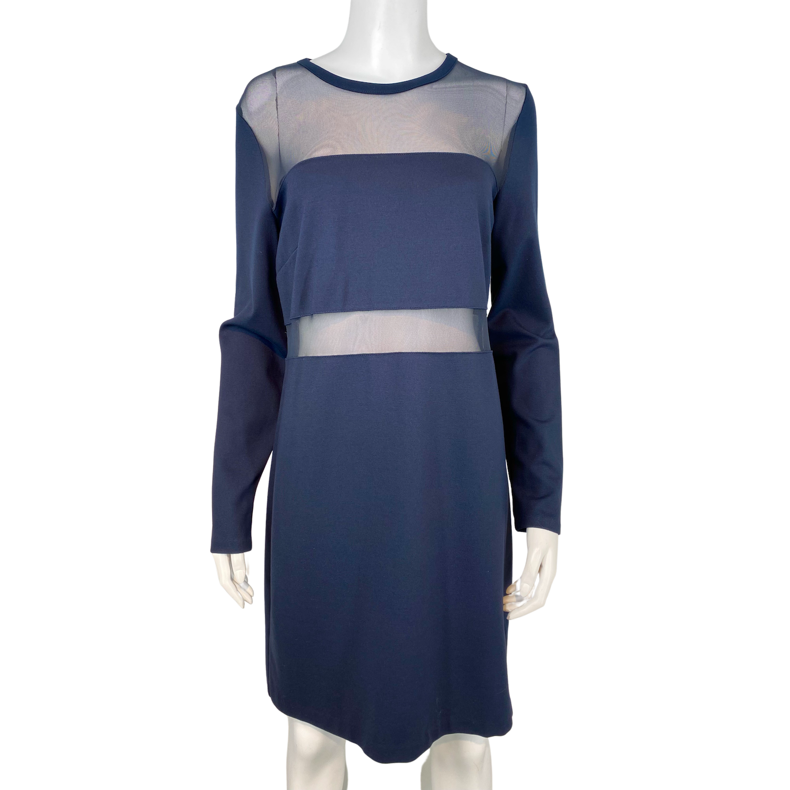 "granatowa dzianinowa sukienka, długi rękaw, zapinana z tyłu na kryty suwak, przy dekolcie oraz w talii transparentne poziome wstawki z siateczki, roz. L, skład: 69% wiskoza, 27% nylon, 4% elastan. Wymiary: szer. biust 48 cm, szer. biodra 52 cm, dł. rękaw 64 cm, dł. całkowita 93 cm."