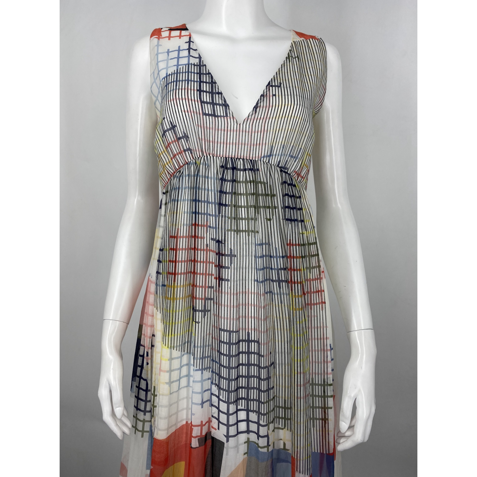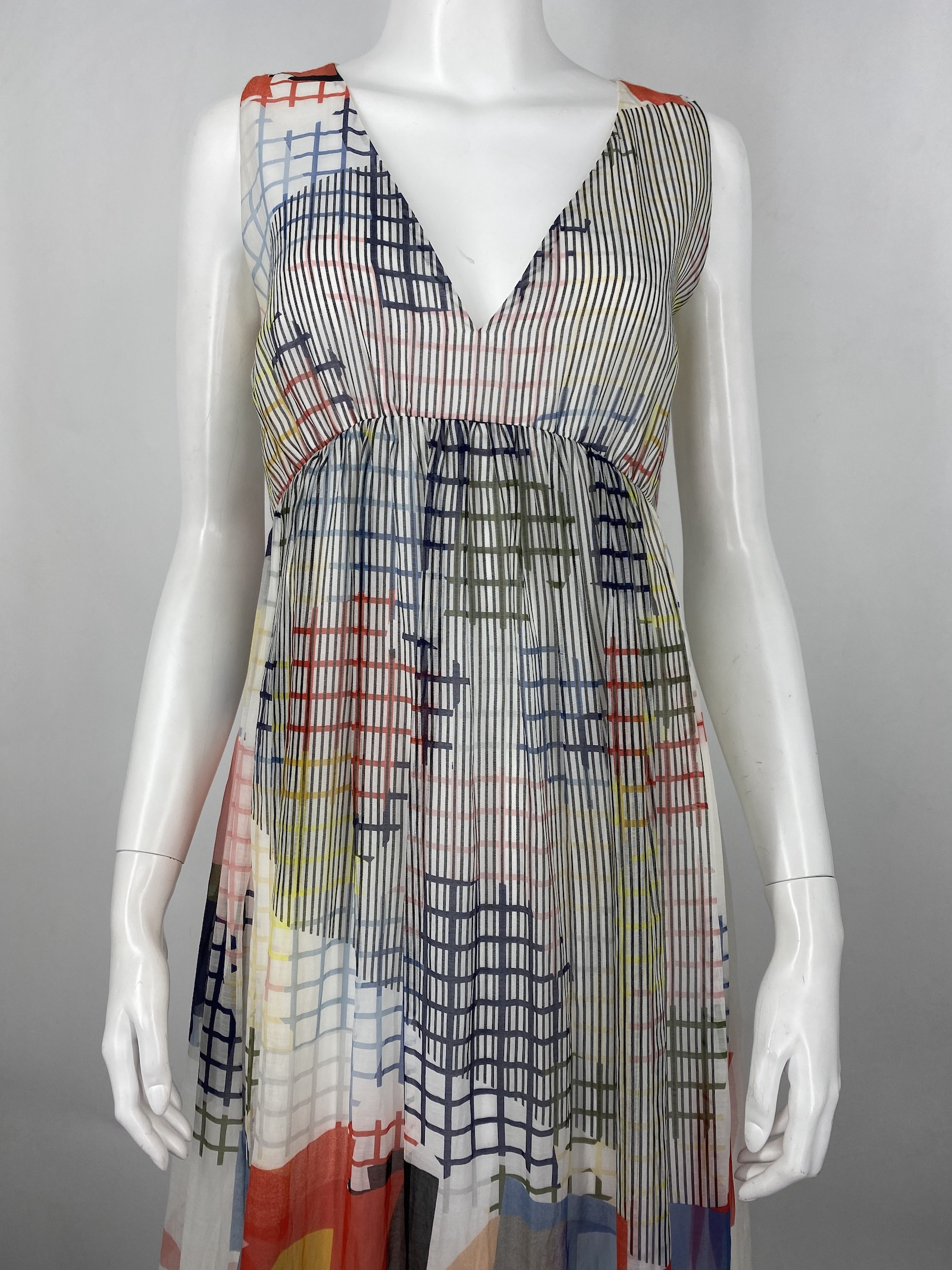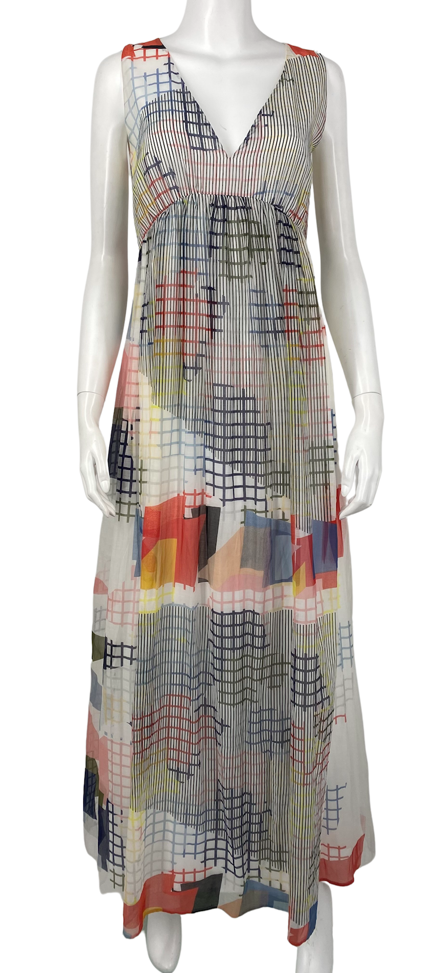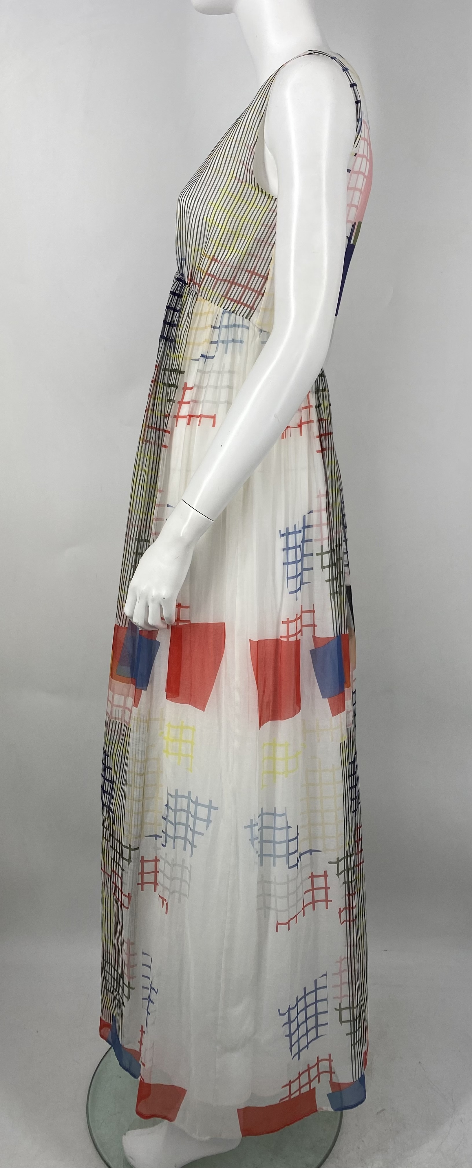 "sukienka maxi, bez rękawów, dekolt V. Biała pokryta cienkim materiałem we wzory- paski, kratki, kwadraty ,czerwono, żółto, zielono, niebieskie, szare. Rozmiar L. Skład: 62% bawełna, 38% jedwab. Wymiary: długość 145cm, szer. biust 43cm, szer. talia 36cm"