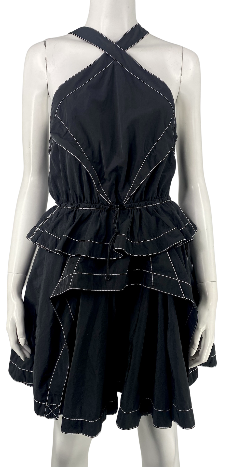 "czarna sukienka ortalionowa, po całości białe przeszycia, ściągacz w talii, rozkloszowana, mini. Rozmiar 4. 100% nylon."