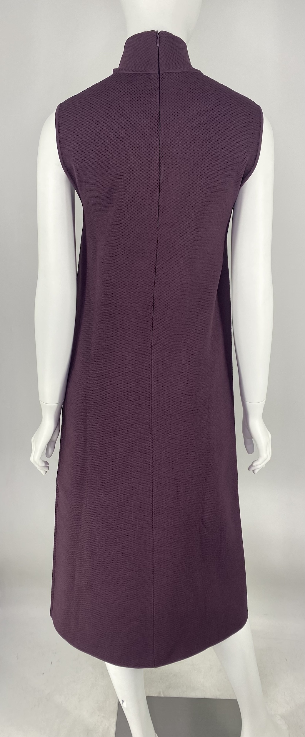 "długa fioletowa sukienka bez rękawów, mocno wycięty dekolt ze wstawką wokół szyi, zapinana z tyłu na kryty suwak. Rozmiar IT 44. Skład:77% bawełna, 16% poliester, 6% poliamid, 1% elastan. Wymiary: szer. ramion 36 cm, szer. biustu 40 cm, szer. talii 44 cm, dł. całkowita 108 cm."