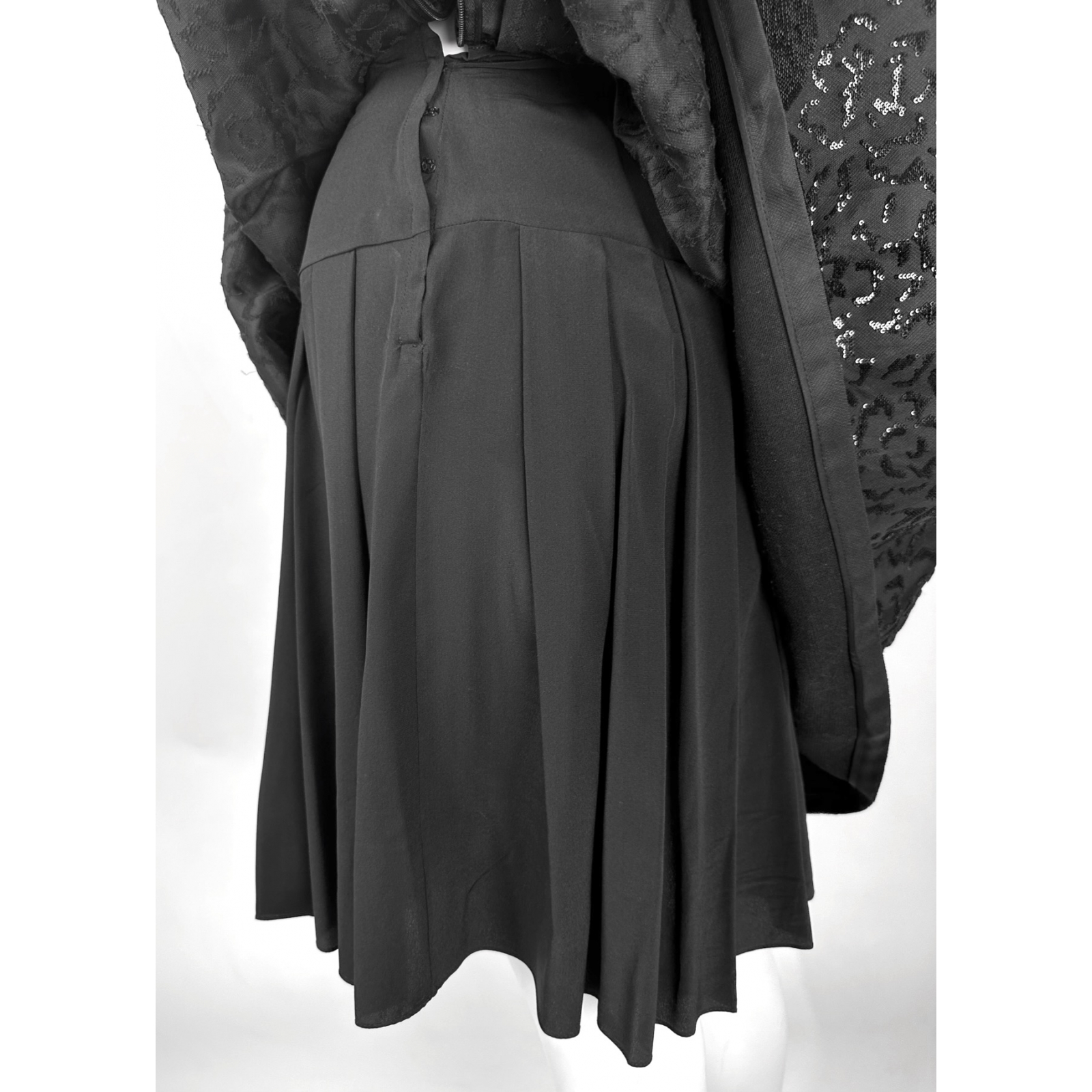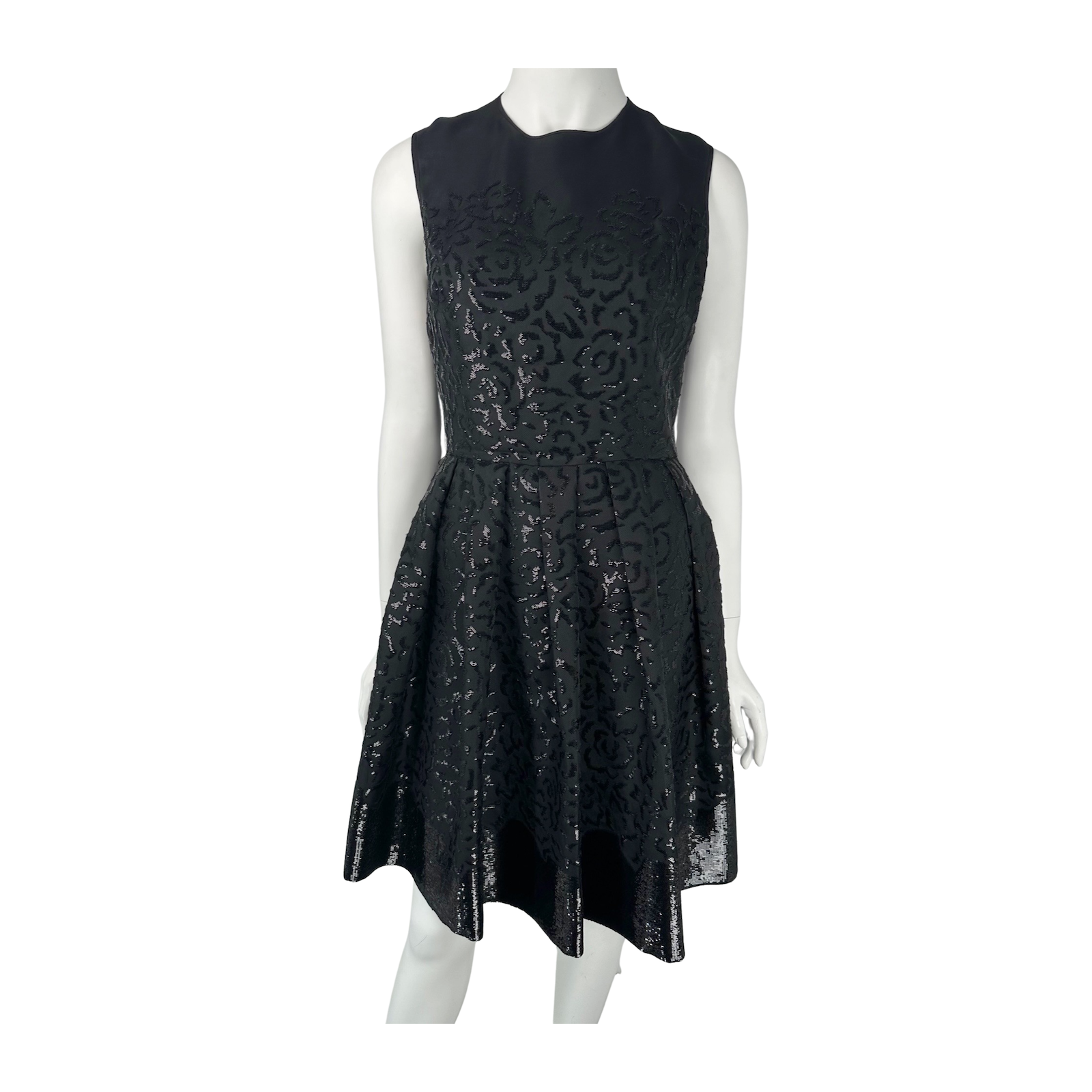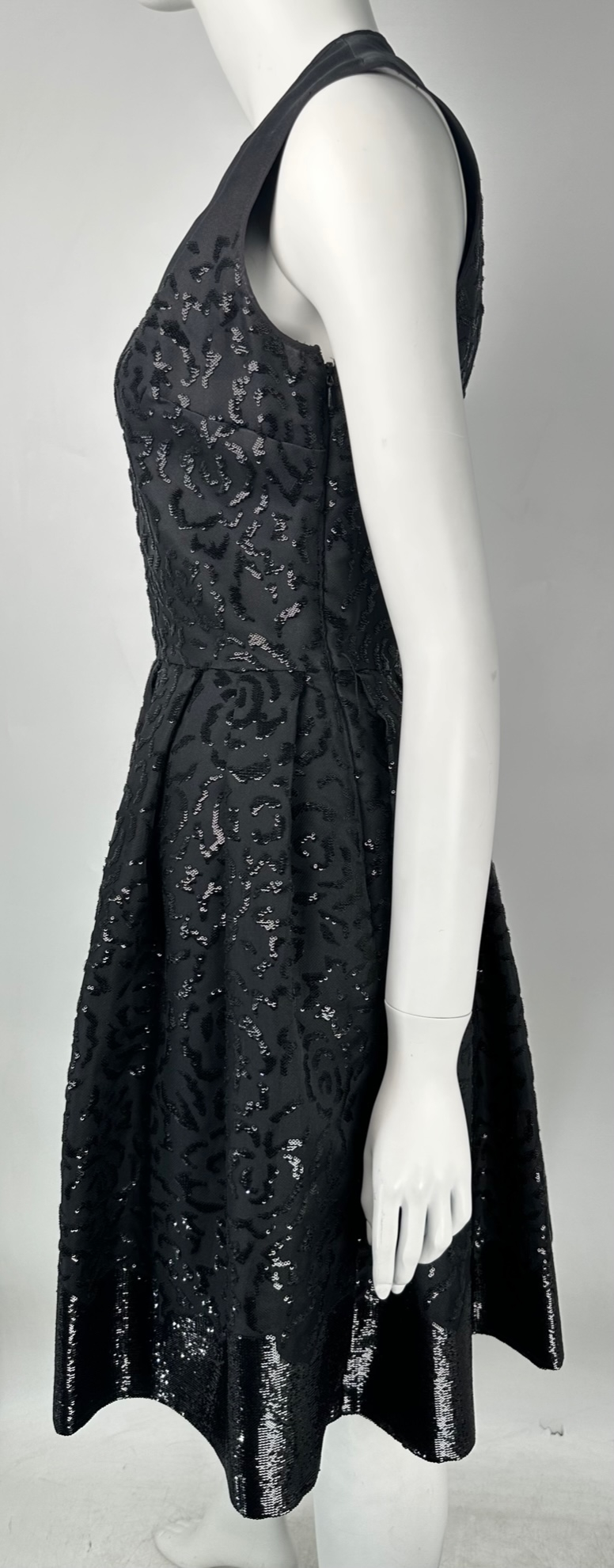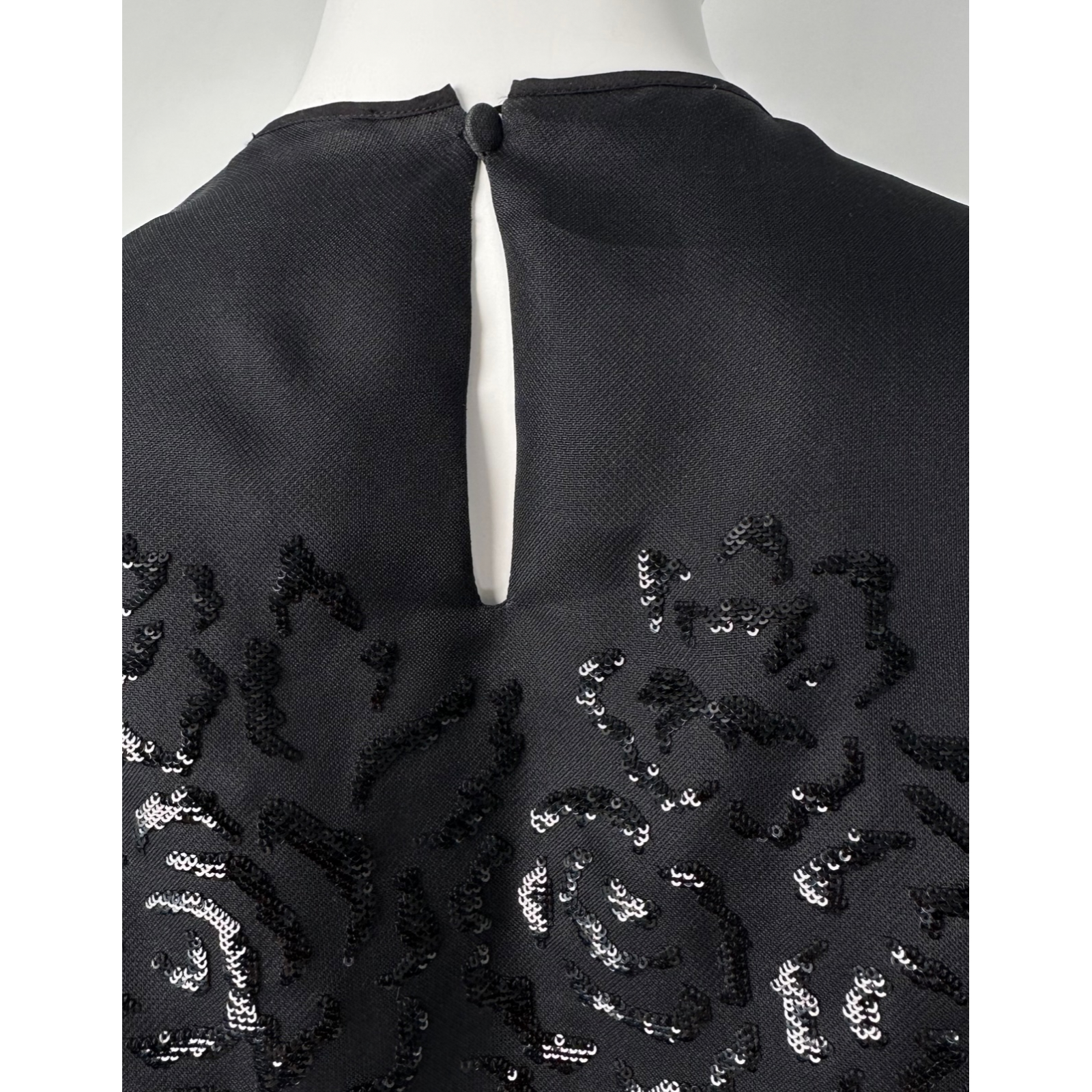 "czarna sukienka wyszywana cekinami, bez rękawów, dół rozkloszowany, taliowana, guzik z tyłu przy dekolcie. Rozmiar 36. Skład: 100 % jedwab. Wymiary: szer. ramion 33 cm, szer. biustu 40 cm, szer. talii 33 cm, dł. całkowita 95 cm."