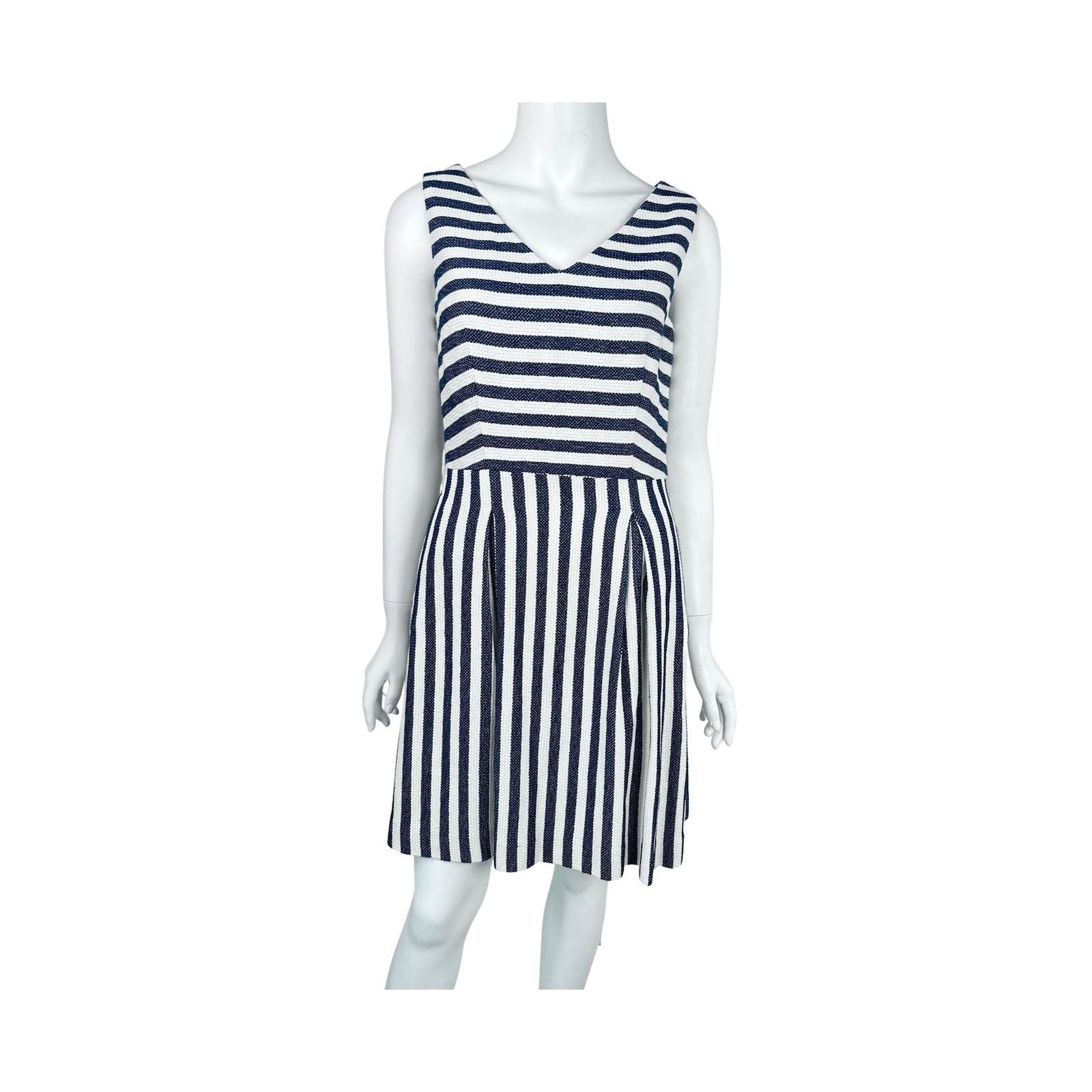 "sukienka bez rękawów w biało granatowe paski, taliowana, dół lekko rozkloszowany, zapięcie z tyłu na suwak. Rozmiar 42. Brak metki ze składem wypada na M. Wymiary: szer. ramion 37 cm, szer. biustu 42 cm, szer. talii 34 cm, dł. całkowita 90 cm."