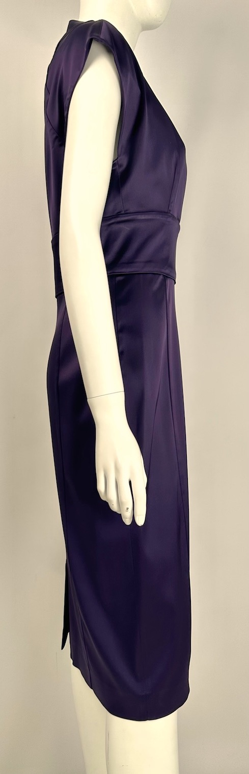"Prosta sukienka bez rękawów w ostrym fiolecie. Ma głęboko wycięty dekolt w kształcie litery: "V", wyraźnie zaznaczoną linię talii i dość wąską spódnicę. Liczne przeszycia są pomocne przy modelowaniu sylwetki. Zapinana jest z tyłu na kryty zamek. Z tyłu znajduje się również krótkie rozcięcie przy samym dole sukienki. Stan: bardzo dobry. Rozmiar z metki: 40. Skład: 75% acetat, 22% poliamid, 3% elastan. Wymiary: dł. (mierzona od karku:) 105 cm., szer. (mierzona od pachy do pachy): 50 cm, szer. (mierzona w pasie): 40 cm., szer. (mierzona w biodrach): 47 cm."