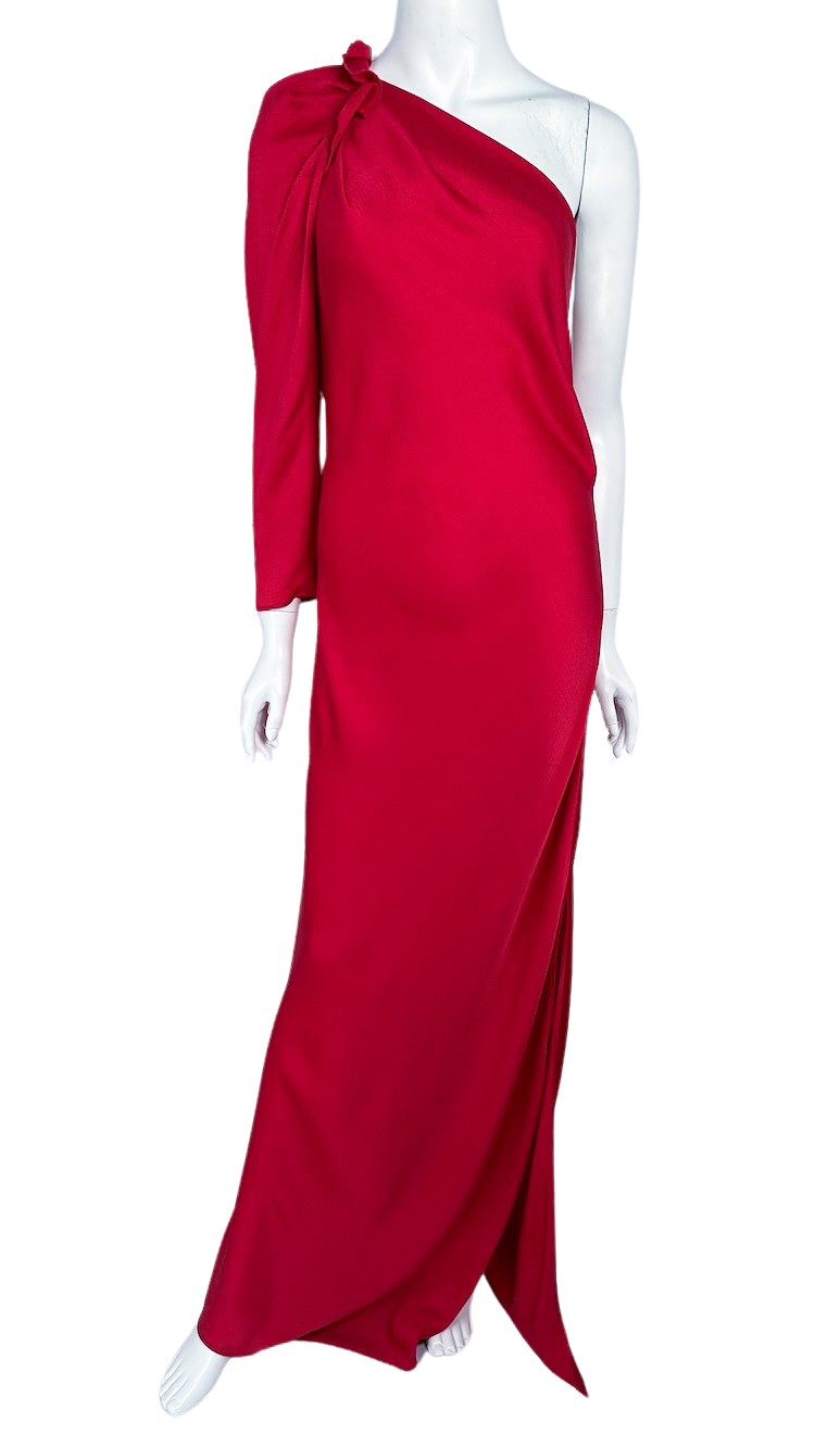 "Czerwona sukienka maxi na jedno ramię, zapina z boku na suwak. Rozmiar. 38. Skład: 57% acetat, 43% viskoza. Wymiary: szerokość mierzona od pachy do pachy 48,5cm, długość rękawa 56cm, długość całkowita 168cm."