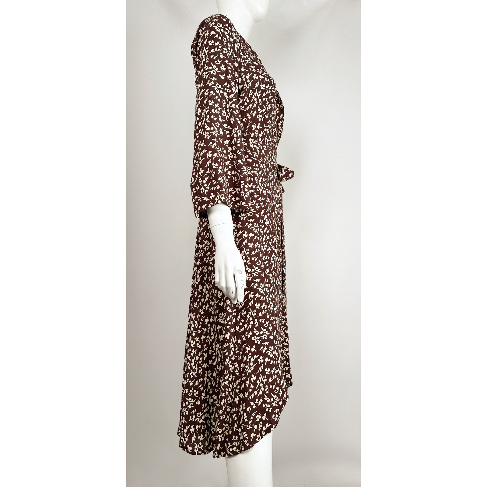 "Brązowa sukienka w kremowy motyw kwiatowy z logo marki, długość za kolano, asymetryczna, zakładana, wykonana z wiskozy, dekolt w serek, szeroki rękaw 3/4, taliowana, rozkloszowany dół, wiązana paskiem w pasie. Rozmiar z metki 34. Skład: 53% wiskoza, 47% wiskoza ECOVERO. Wymiary: szerokość mierzona od pachy do pachy 48cm, długość rękawa 51cm, długośc całkowita 112cm."