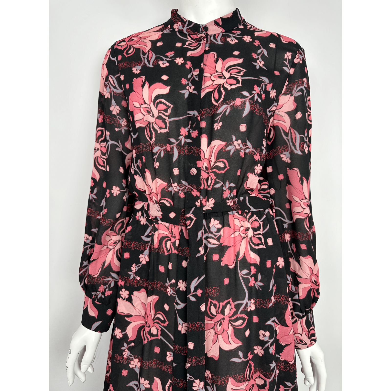 "Czarna sukienka z długim rękawem w motyw różowych kwiatów z logo marki, szmizjerka, delikatnie transparentna, taliowana, guma oraz wiązany pasek w talii, długość maxi, stójka, zapinana na guziki w górnej części, rozpinane mankiety. Rozmiar z metki IT 40. Skład: 100% wiskoza. Wymiary: szerokość mierzona od pachy od pachy 49cm, długość całkowita 136cm, długość rękawa 59cm."