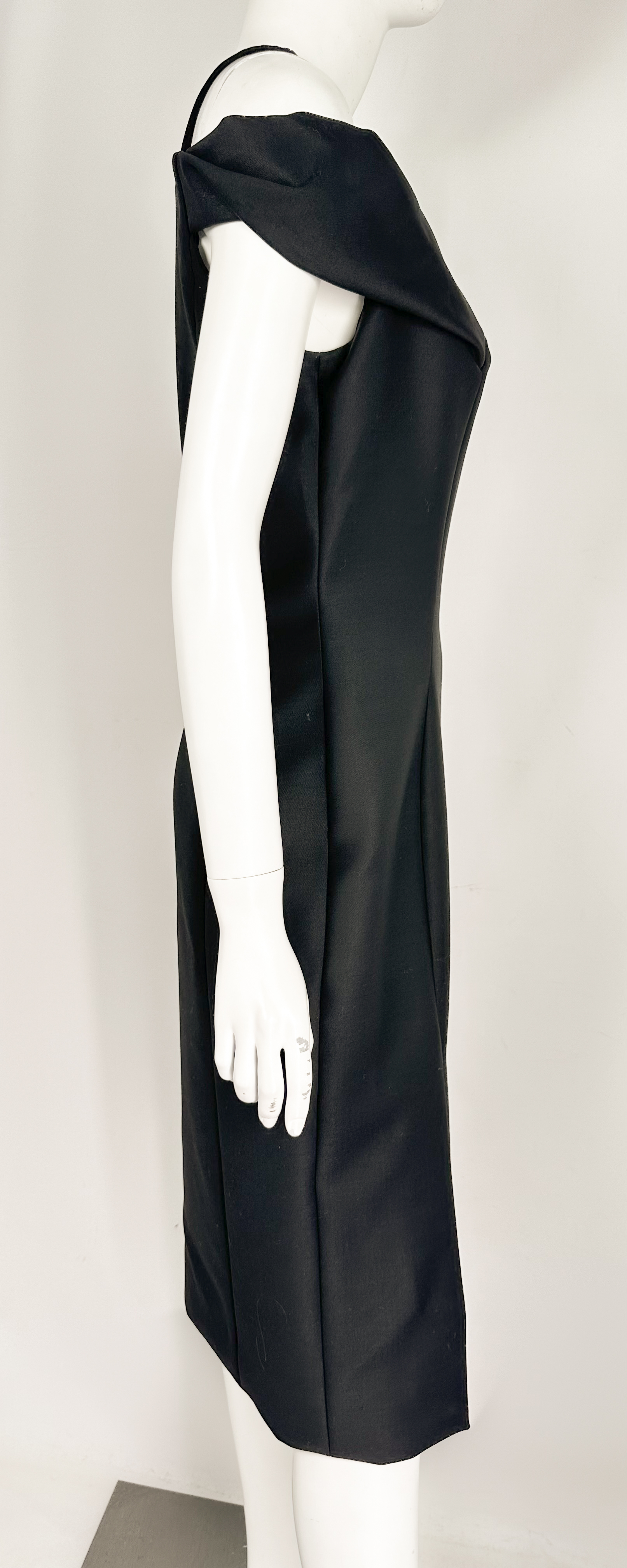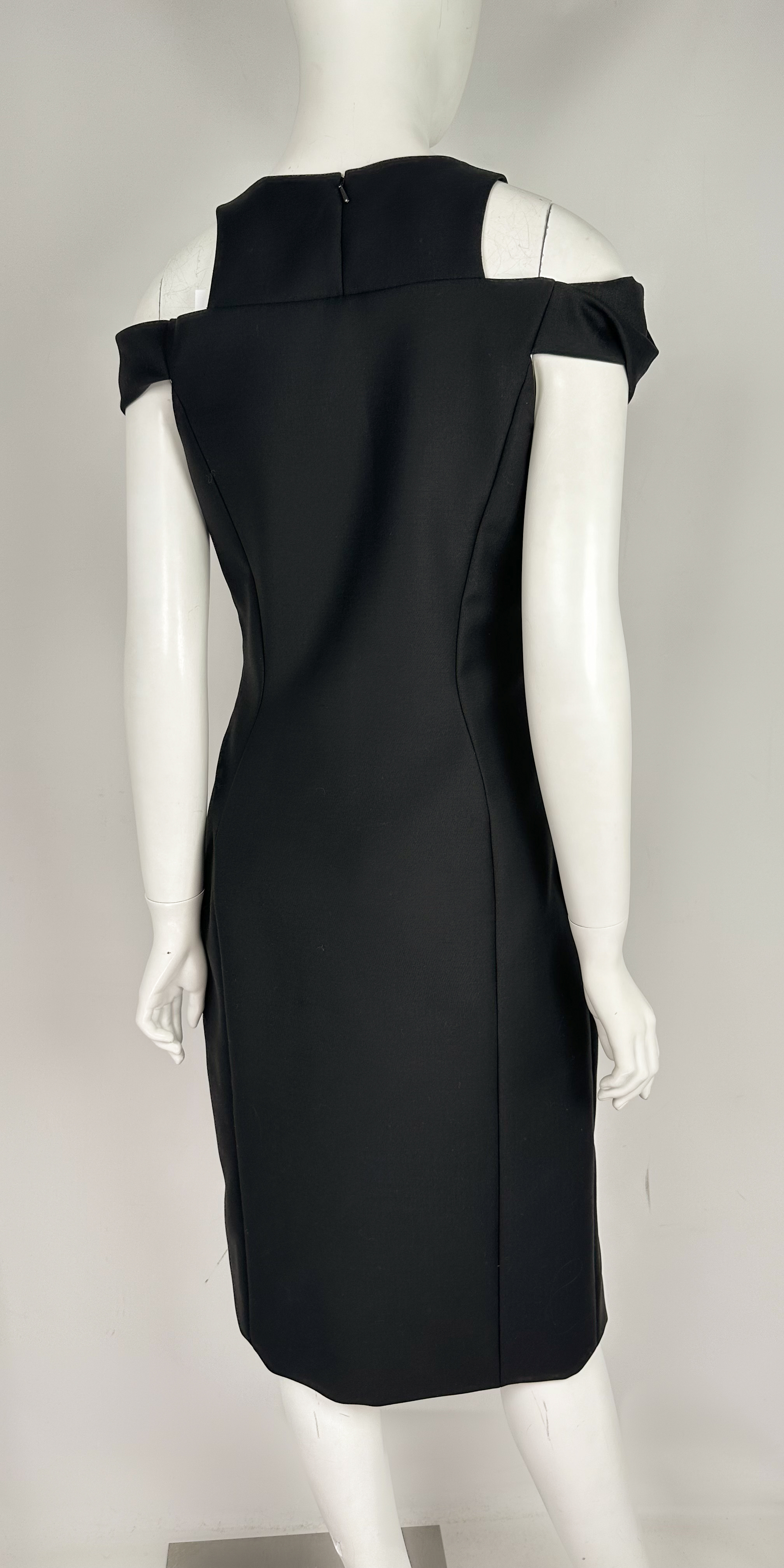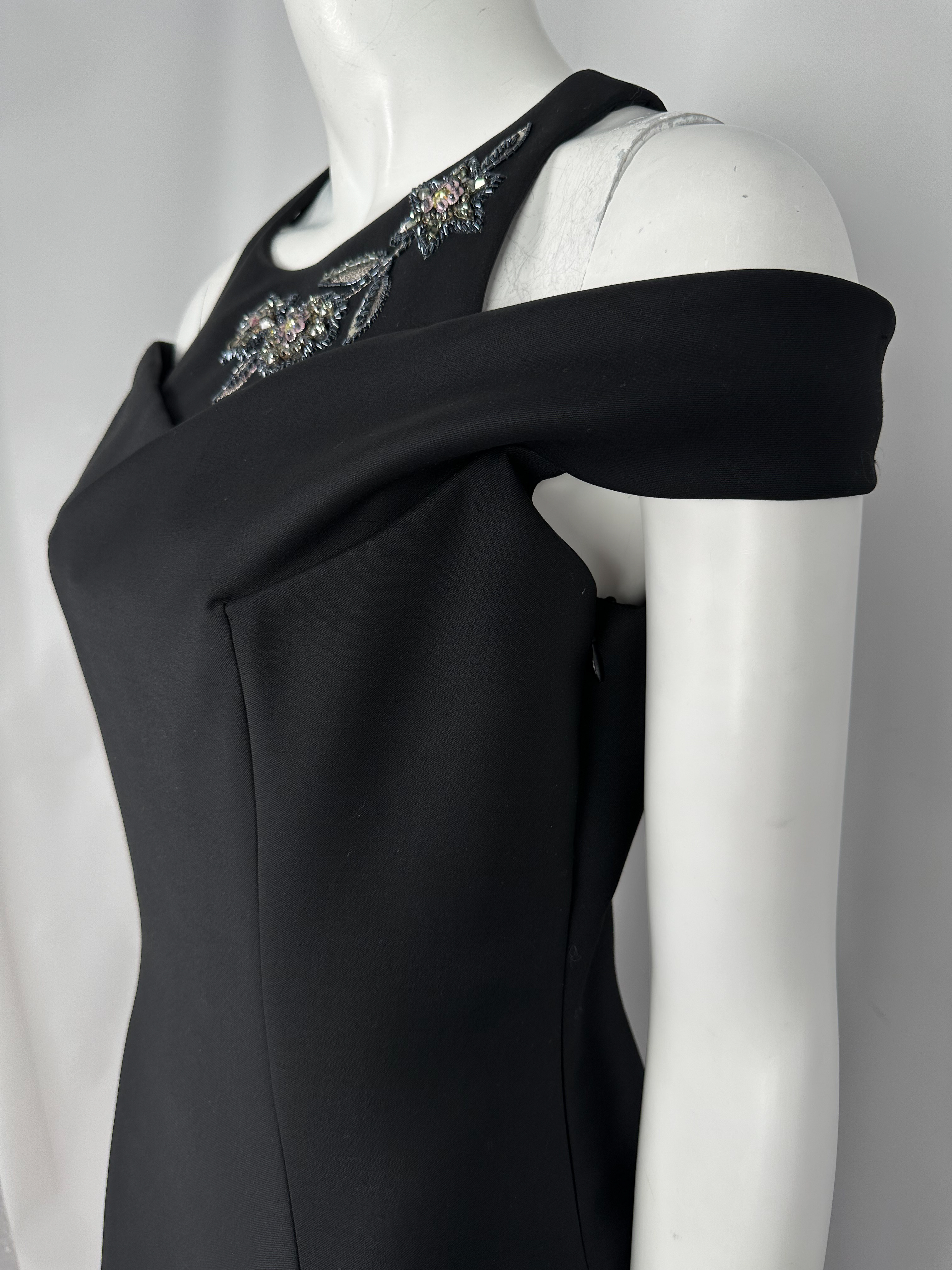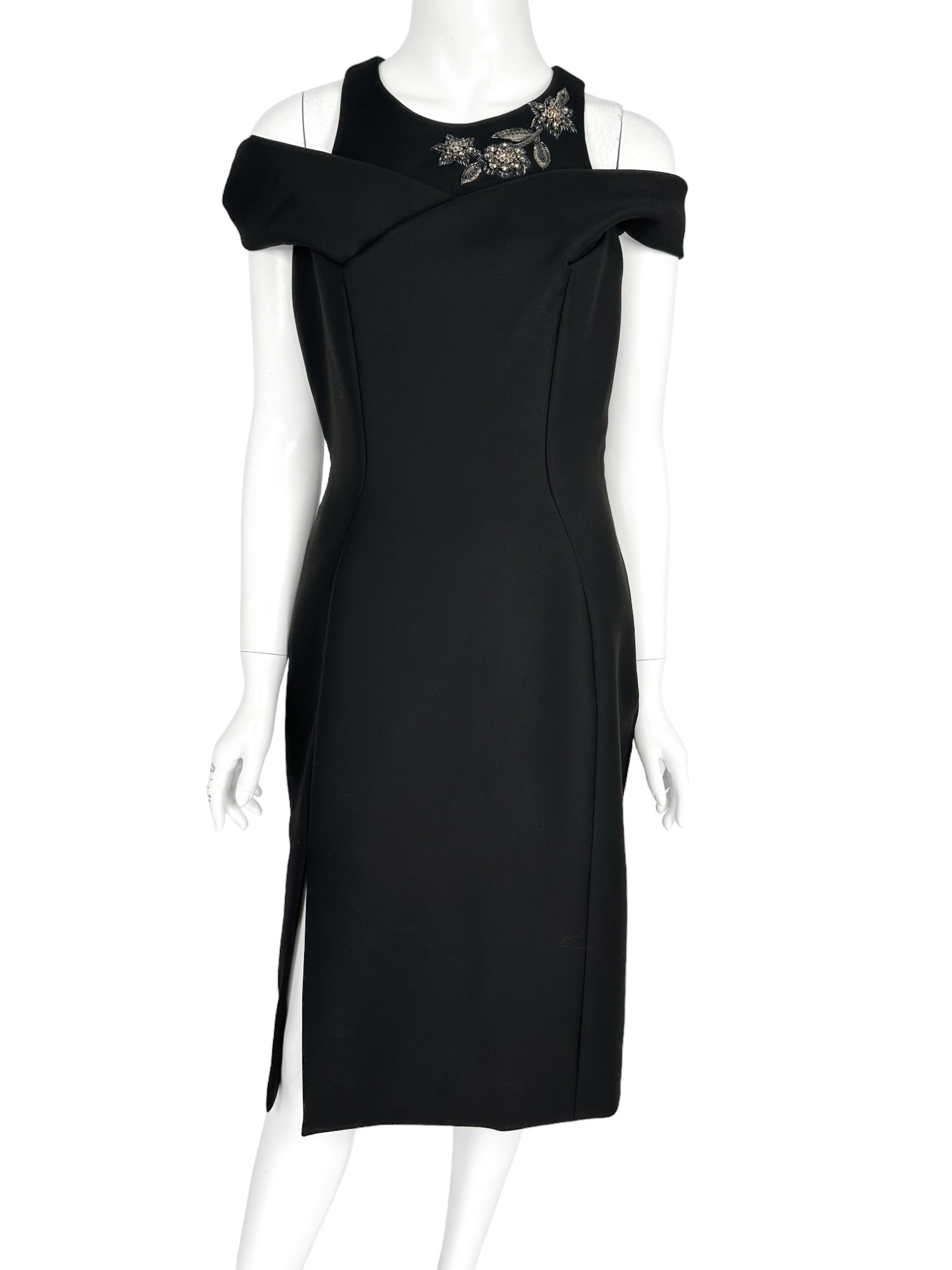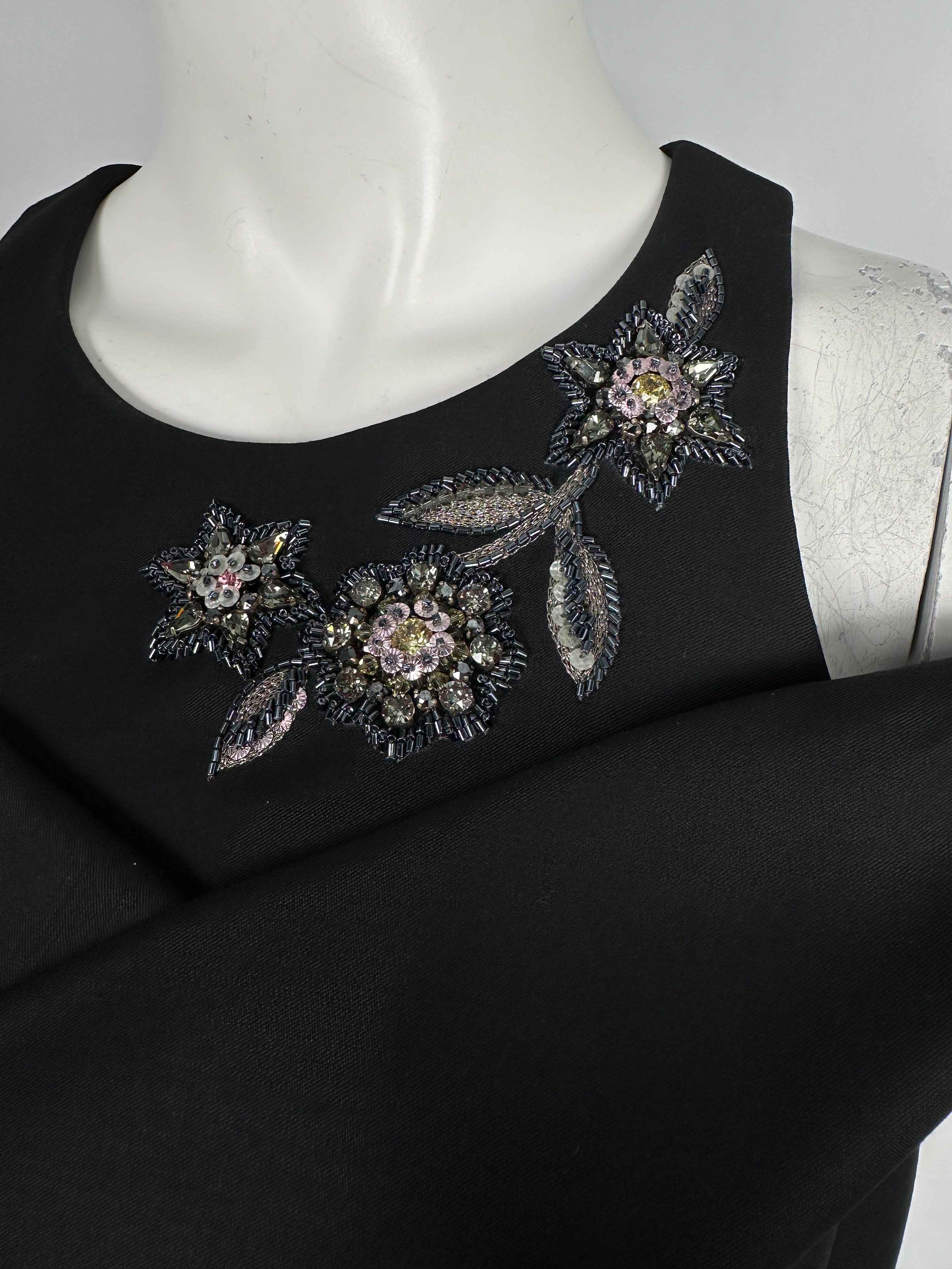 "Czarna wełniana sukienka bez rękawów ozdobiona kwiatową grafiką wysadzaną kolorowymi kryształkami oraz marszczeniem przy dekolcie, rozcięcie na prawej nodze, delikatnie taliowana, odkryte ramiona, zaokrąglony dekolt, długość za kolano, zapinana w tylnej części na kryty suwak oraz haftkę, proste przeszycia. Rozmiar z metki IT 44. Skład: 95% wełna dziewicza, 4% poliamid, 1% elastan; podszewka: 87% jedwab, 13% elastan. Wymiary: szerokość od pachy do pachy 44cm, długość całkowita 107cm, szerokość w talii 38cm."