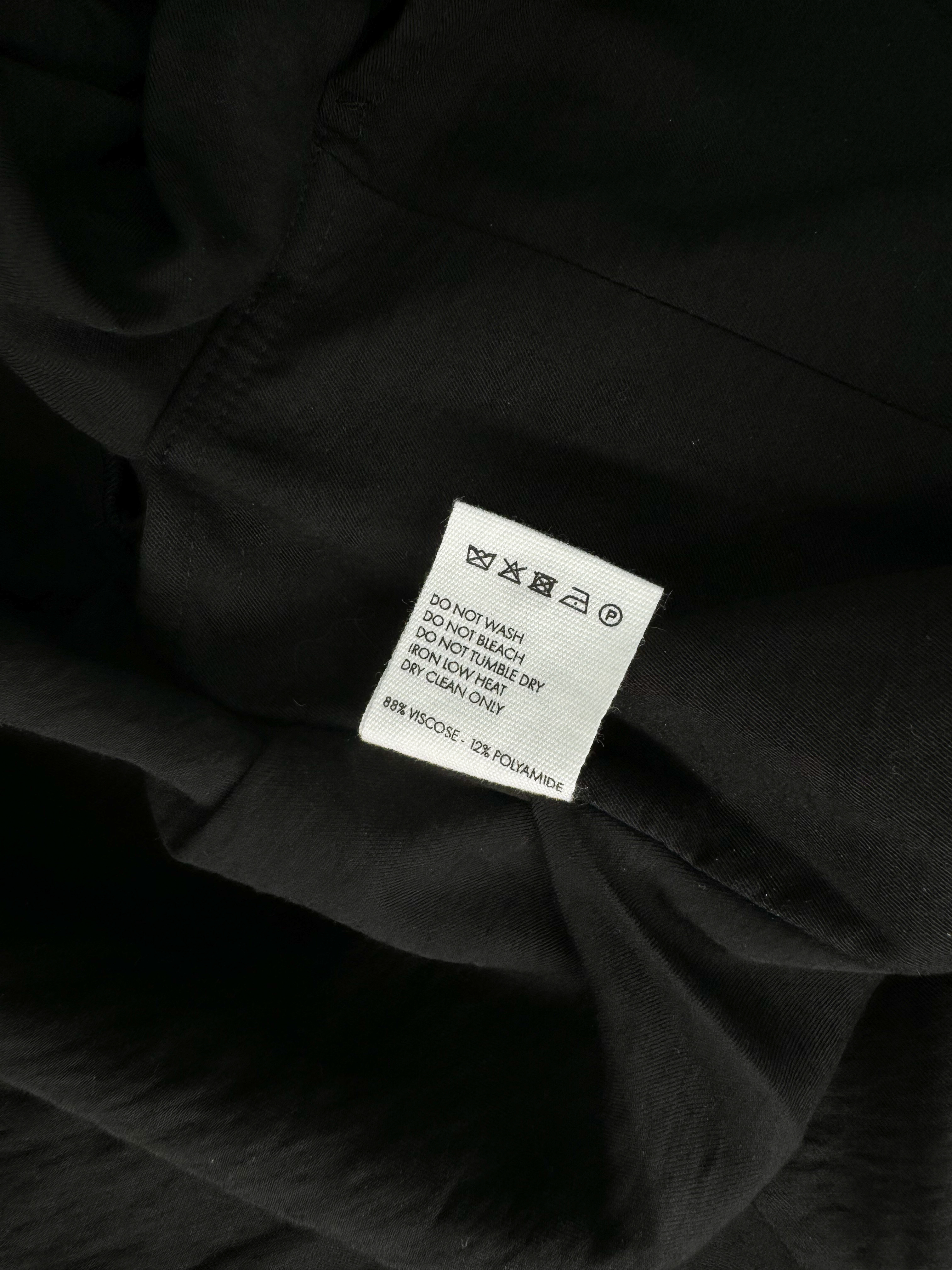 "Czarna koszulowa sukienka, głęboki dekolt, zapinana na guziki, taliowana, ozdobiona marszczeniem w centralnej części, rozpinane mankiety, asymetryczna, zaokrąglony dół. Stan nowa z metką. Skład: 88% wiskoza, 12% poliamid. Rozmiar z metki FR 36. Wymiary: szerokość mierzona od pachy do pachy 41cm, długość całkowita 86cm."